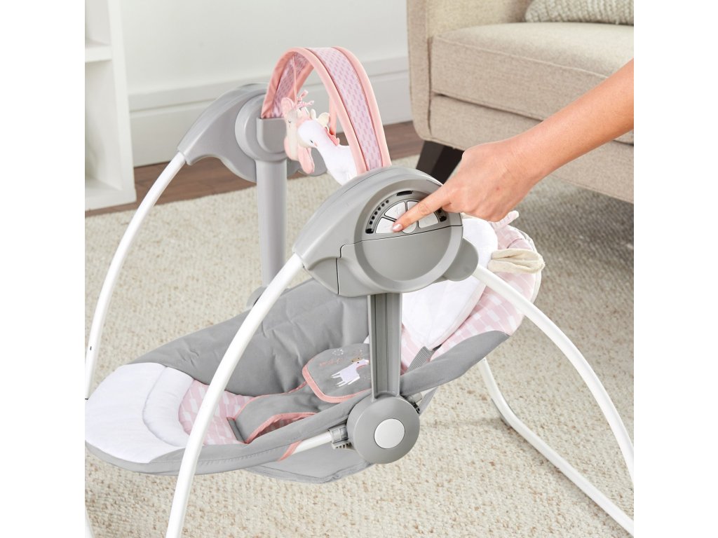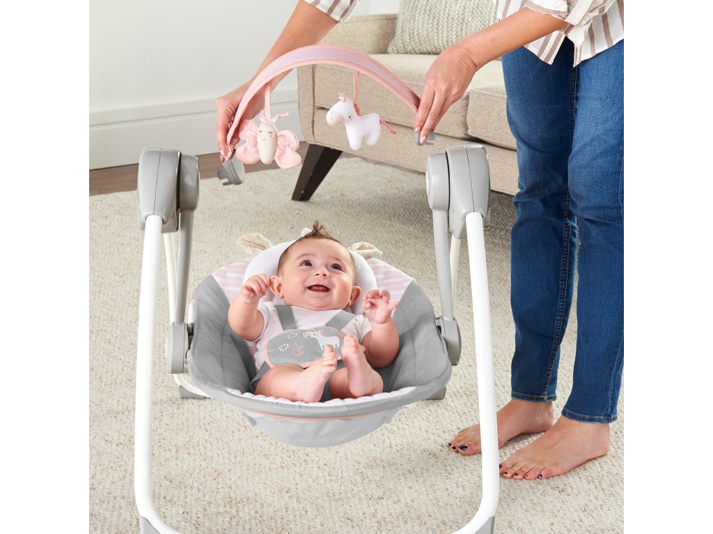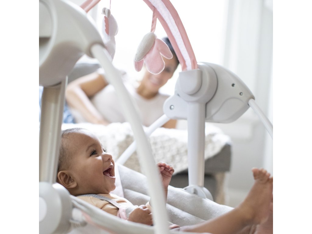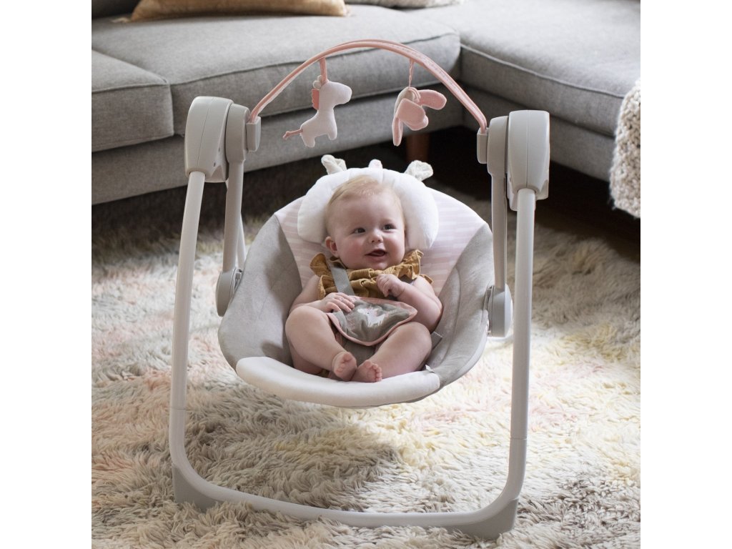 Navrženy s ohledem na rodičovství. Maximální pohodlí kdykoliv a kdekoliv s houpačkou Flora the Unicorn značky Ingenuity. Super kompaktní houpačka, která v sobě zachovává všechny nejdůležitější funkce velké houpačky. Tato lehká houpačka je vybavena množstvím funkcí včetně polohování sedáku do 2 poloh, hrazdičkou s 2 plyšovými hračkami, která se dá jednoduše odstranit pro snadný přístup k dítěti a technologií, která umocňuje uklidňující zážitek děťátka. Získejte pro sebe několik volných okamžiků díky časovači, který lze nastavit na 30, 45 nebo 60 minut. Uklidněte děťátko 12 melodiemi, z nichž všechny mají možnost nastavení hlasitosti. Houpačka je zabalena do dokonalých jemně ladících textilií. A i když se vám přihodí nějaká malá nehoda, tak opěrku hlavy a textilie sedací části můžete jednoduše vyprat v pračce. Sladký růžový design, hračky motýl a jednorožec, z ní dělají ideální houpačku pro holčičku. Používejte od 0 do 9 měsíců.