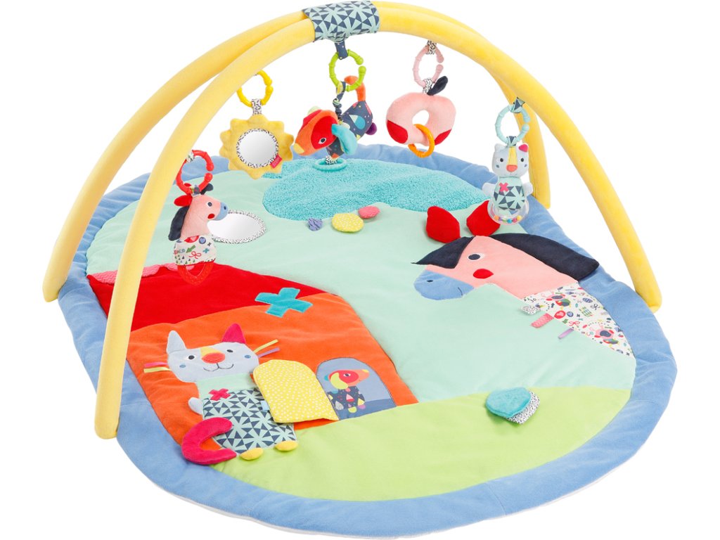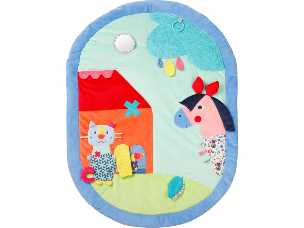 Vašeho mrňouska spolehlivě zaujme barevná ležící plocha z různých materiálů a skrytých herních funkcí. Děťátko tak objeví chrastítka a pískání v uších koně, šustění listí a střešních tašek, pískání na nose kočky a také šustění dveří, za kterými se skrývá pejsek. To vše děťátko stimuluje a vyzývá k představivosti, cítění, mazlení a hraní.