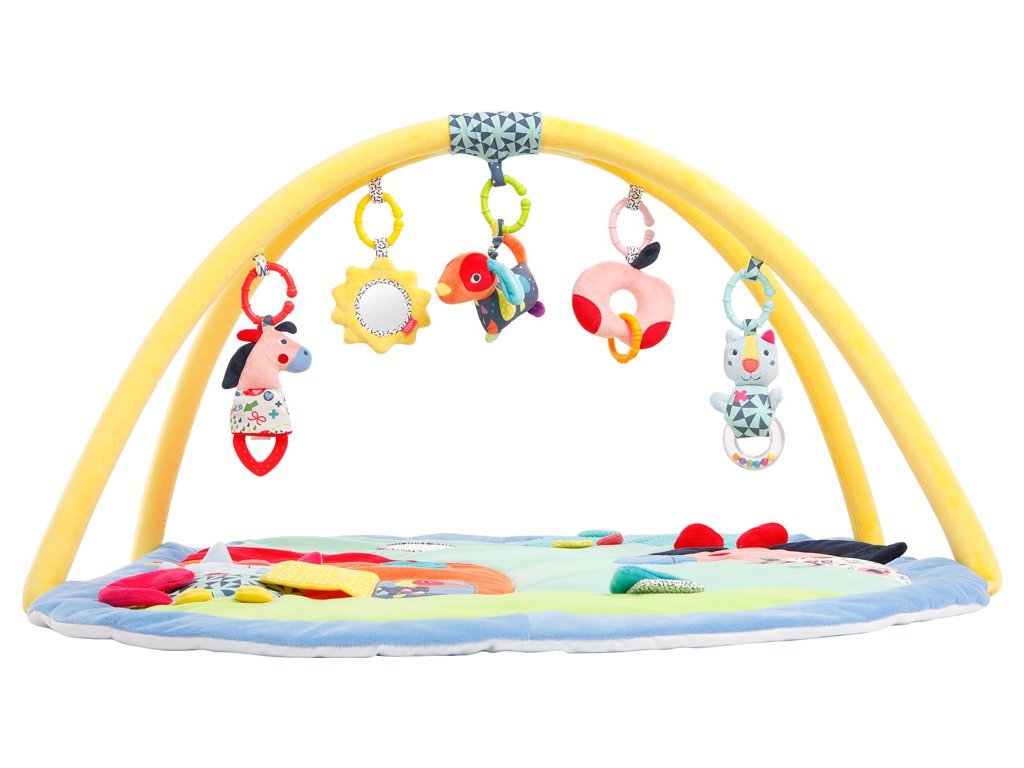 Trojrozměrné postavičky visící na hracím oblouku pak napomáhají cílenému uchopení a koordinaci ruka-oko. Pískací kůň s hryzátkem, šustící zrcadlové slunce, pes s vibrujícím chrastítkem, cvrlikající jablko s uchopovacím kroužkem a šustící kočka s chrastítkem podporují zábavu při hraní, zvyšují pozornost dítěte a tříbí jeho smysly i motoriku.