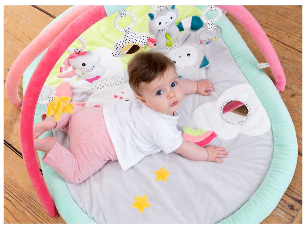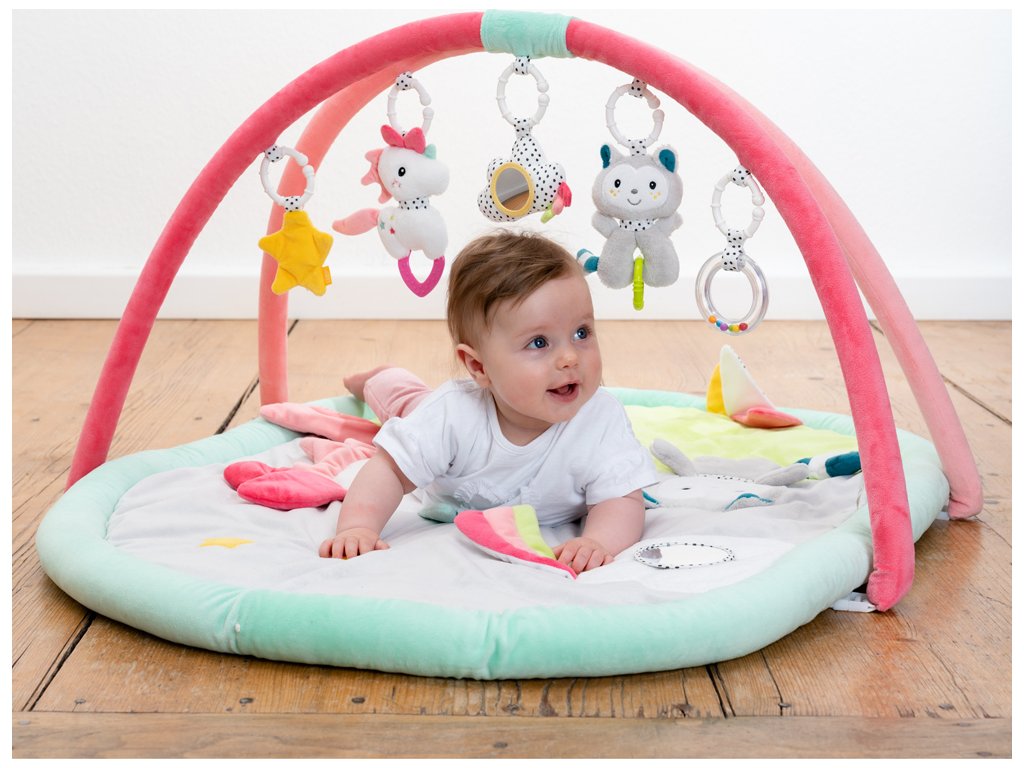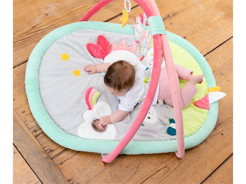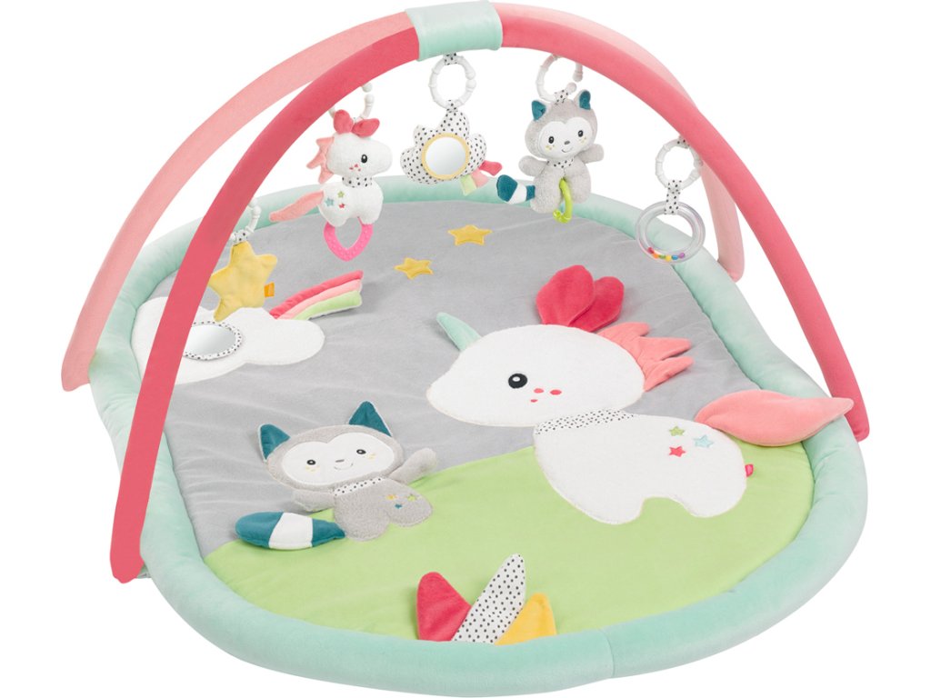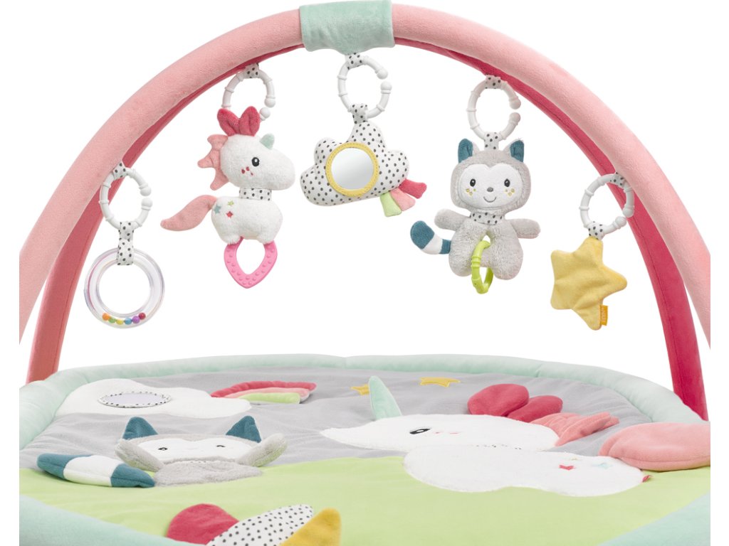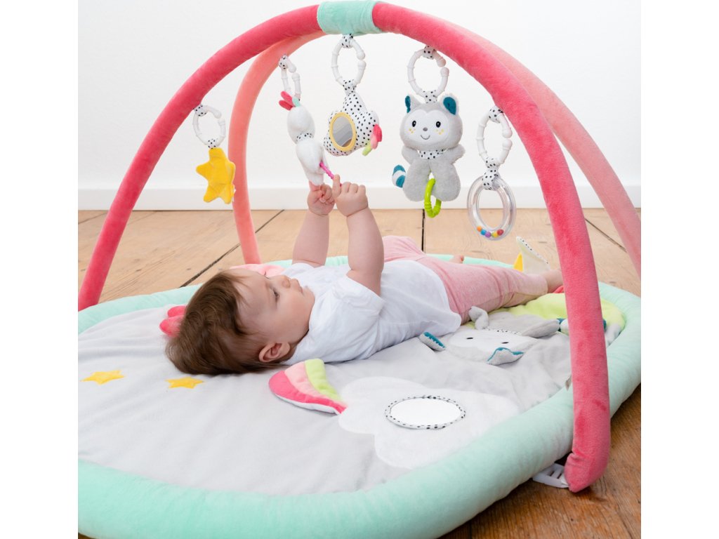 Měkká prošívaná deka Aiko & Yuki zve dítě k dotyku, mazlení a hraní na ležící ploše s rozmanitými materiálovými strukturami a povrchy. Trojrozměrné postavičky visící na hracím oblouku napomáhají cílenému uchopení a koordinaci ruka-oko. Dítě tu zaujme pískací jednorožec a v něm skrytý křeček, chrastící kočka, cvrlikající mrak a šustící hvězda. Veselá zvířátka tak podporují zábavu při hraní, zvyšují pozornost dítěte a tříbí jeho smysly i motoriku.