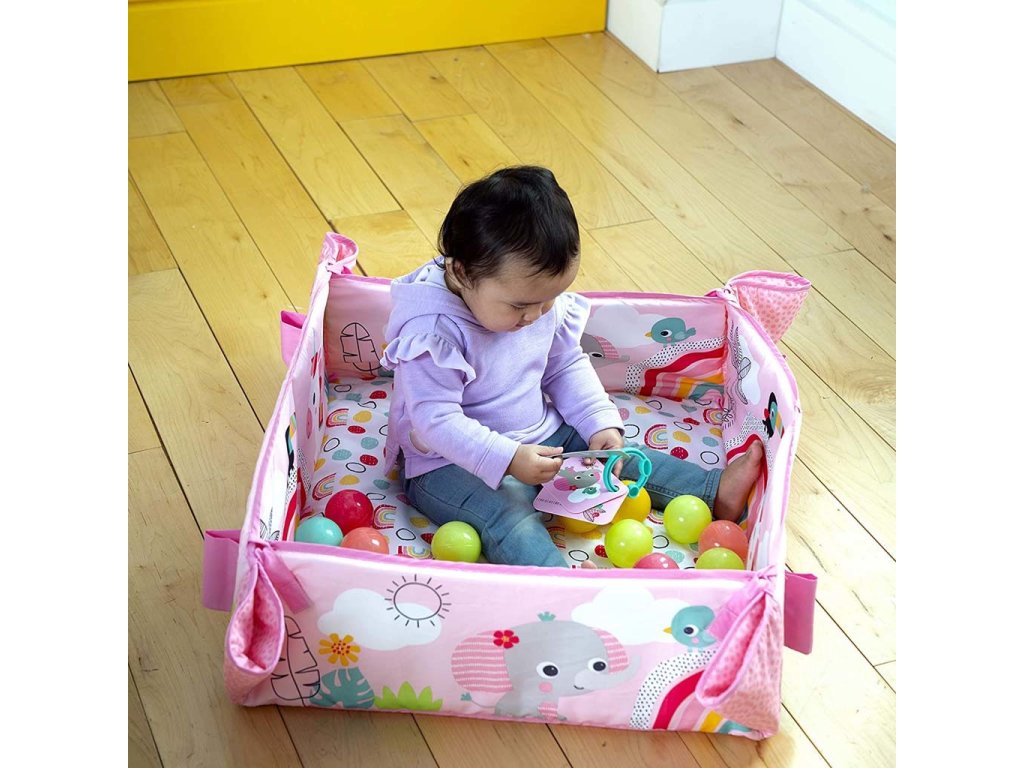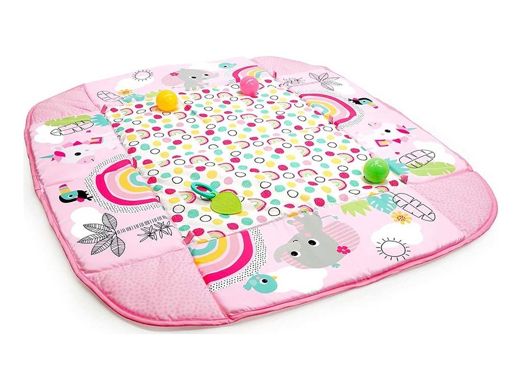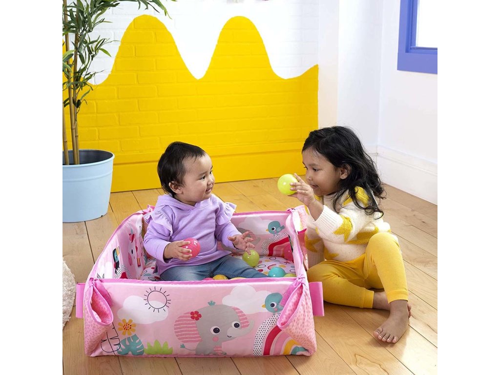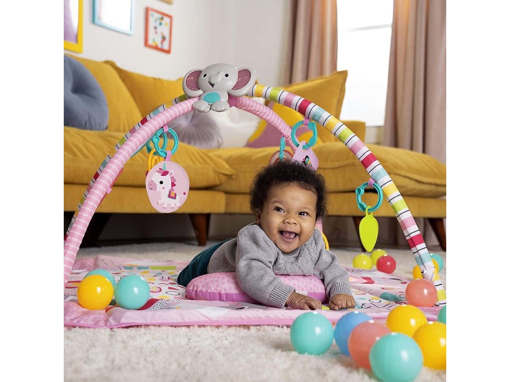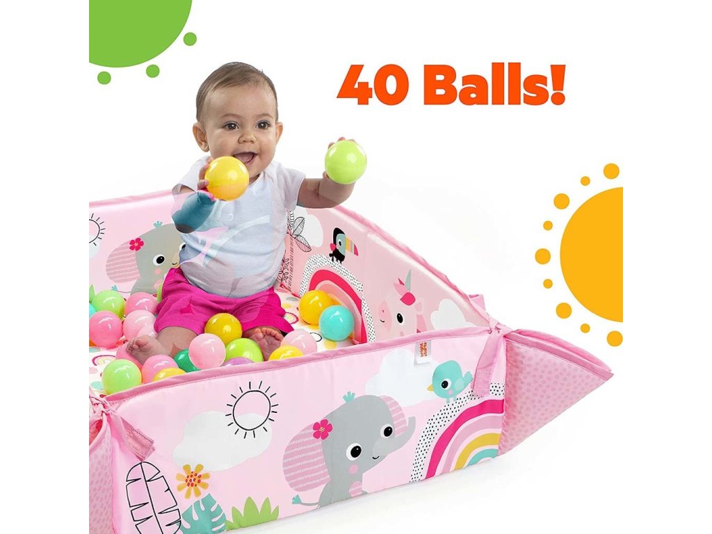 Tato deka s 5 způsoby hry je velmi flexibilní a přizpůsobí se potřebám vašeho dítěte v jakémkoliv věku. Plyšové bočnice deky můžete nastavit směrem nahoru a naplnit tak herní tělocvičnu 40 barevnými míčky, čímž poslouží jako ohrádka aby se nerozkutálely po celém pokoji. Maminka a tatínek se mohou také zapojit do akce pouštěním míčků přes otvor v síťované stříšce.