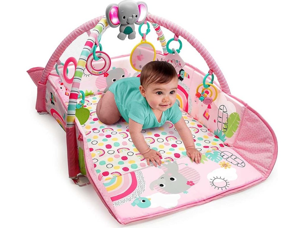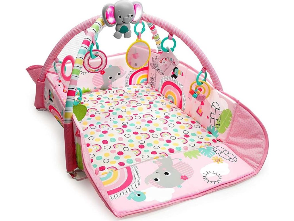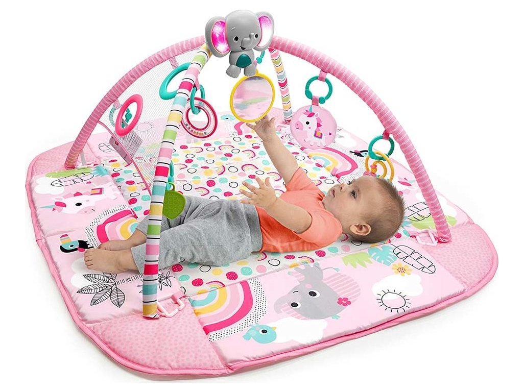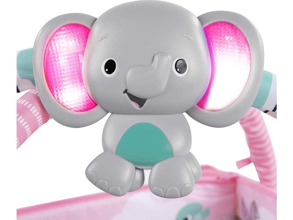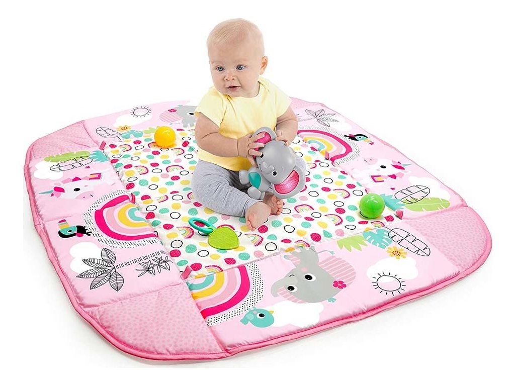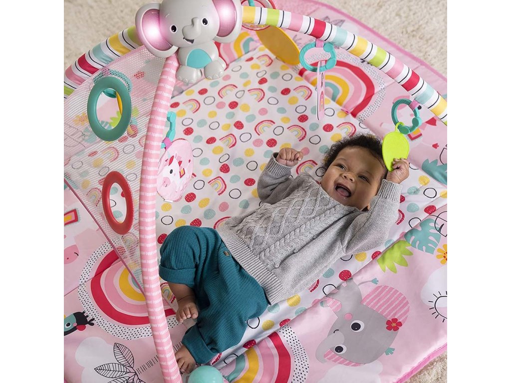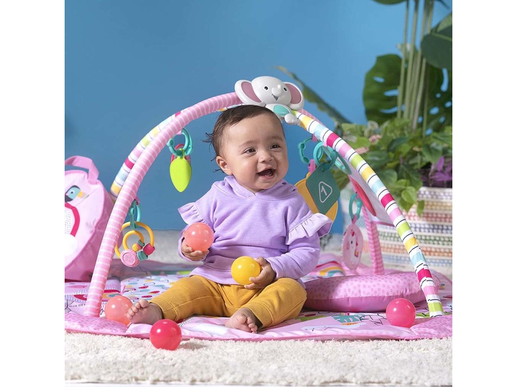Když dítě vyroste, může si samo procvičovat motorické dovednosti pouštěním míčků ze stříšky nebo kutálením či podáváním míčků sem a tam! Pro menší miminka se hrací deka rozloží celá, kde děťátko může strávit čas na zádíčkách a hrát se s hračkami na hrazdičce nebo se s nimi zahrát na bříšku při podpoře s polštářkem, který je také součástí. Veselý sloník svítí a hraje hudbu více než 20 minut a samozřejmě si ho můžete vzít s sebou i na cesty. Pozornost děťátka samozřejmě upoutají i další hračky y jako Provlékačka s korálky, hračka jednorožce, bezpečné zrcátko, barevné karty, kousátko ve tvaru listu a chrastítko s korálky. Hurá za zábavou!
