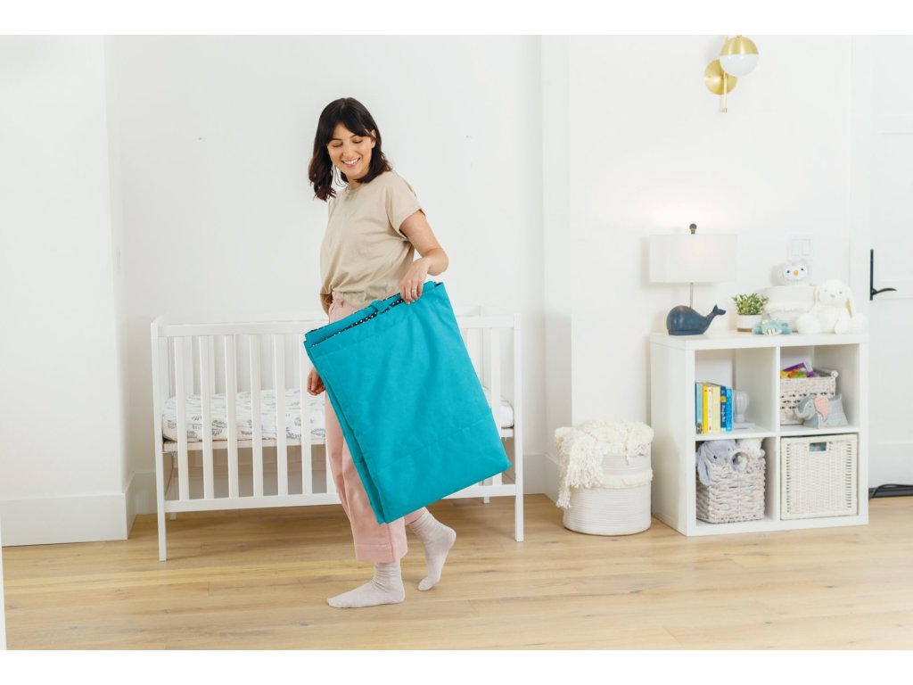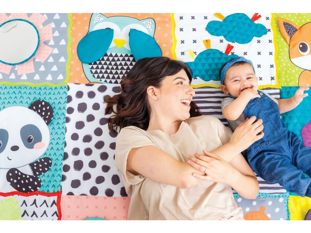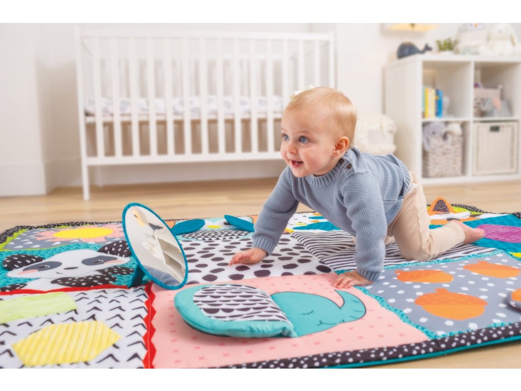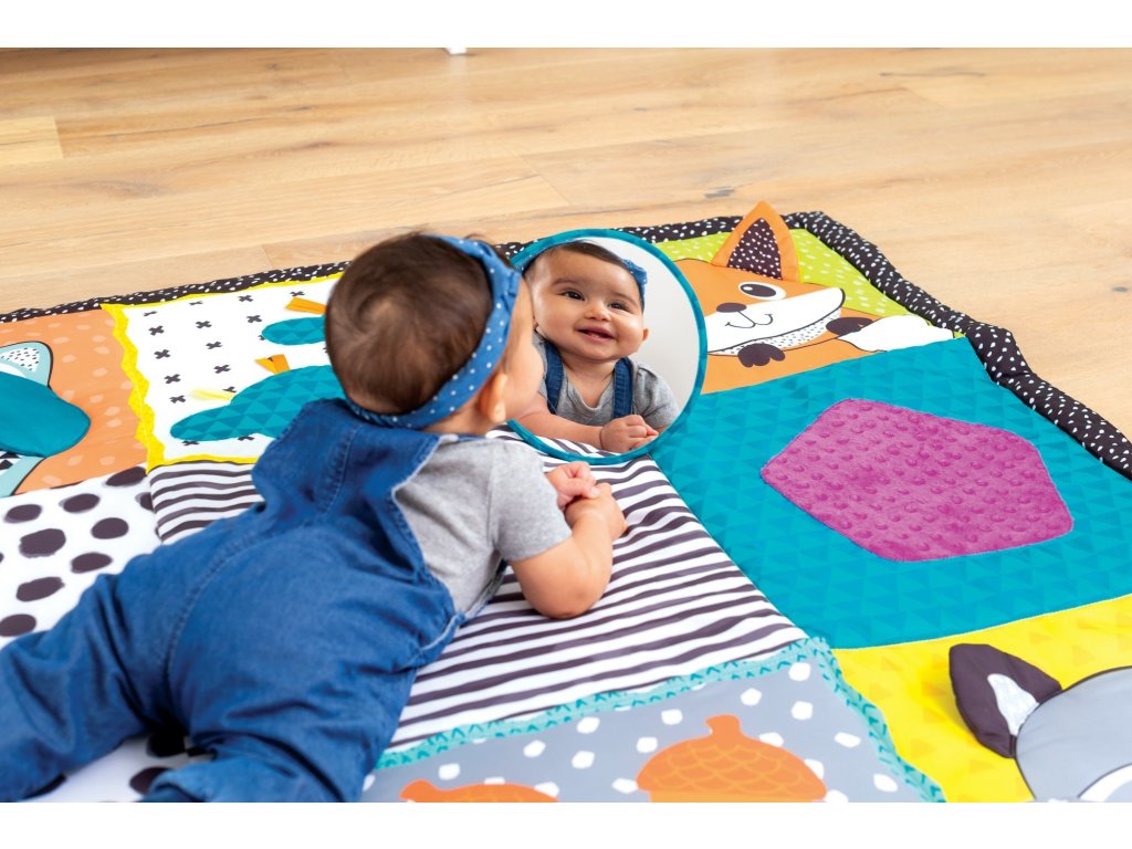 Extra velká měkká hrací deka poskytne vašemu dítěti dostatek prostoru i pohodlí pro hraní na zemi. Vysoce kontrastní obrázky i bezpečné zrcátko stimulují zrak dítěte, různorodé textury lákají ke zkoumání a podporují tak rozvoj hmatu dítěte. Usměvavé obrázky zvířátek pomáhají rozvíjet emoční inteligenci dítěte. Zrcátko je možné postavit před dítě pro podporu hraní v poloze na bříšku, která je důležitá pro rozvoj svalů dítěte.