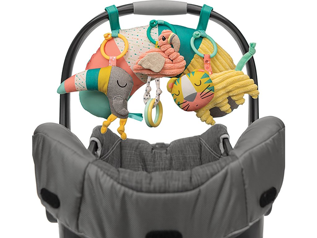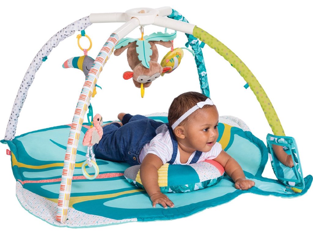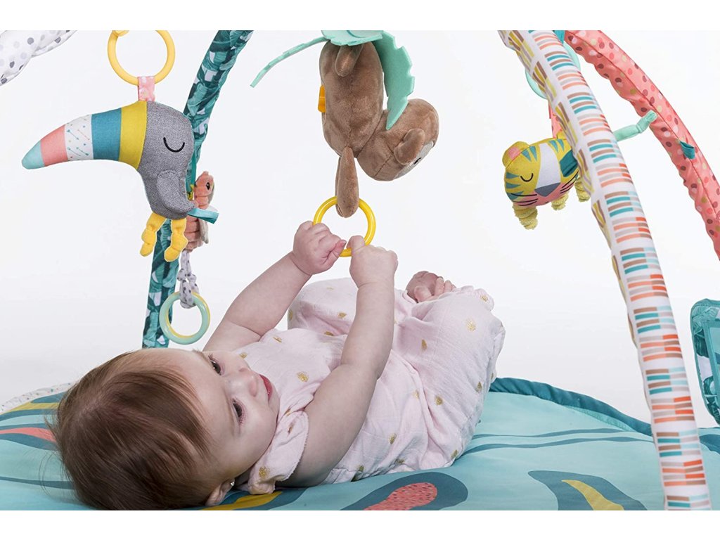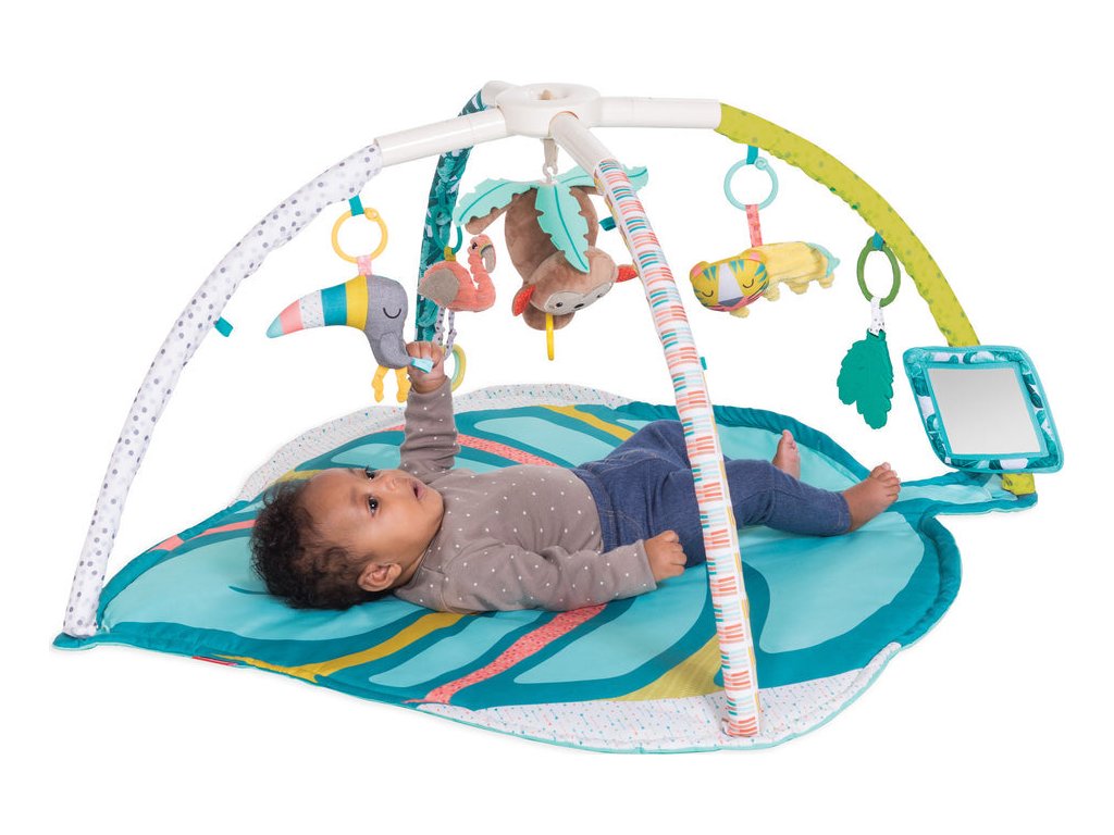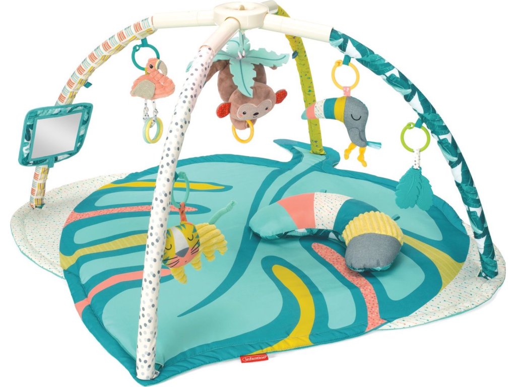Hrací deka s krásnými ilustracemi a hračkami v podobě zvířátek ze zoo nabízí množství aktivit, které stimulují rozvoj jednotlivých smyslů dítěte. Speciální polštářek a bezpečné zrcátko podněcují dítě ke hře na bříšku. Závěsné hračky je možno připevnit k ramenům hrazdy, aby je dítě mohlo zkoumat při ležení na zádech, nebo se mohou připevnit k polštářku pro hraní v poloze na bříšku. Hudební box v podobě plyšové opičky hraje po natažení melodii a můžete jej používat i samostatně např. na autosedačce nebo v kočárku.