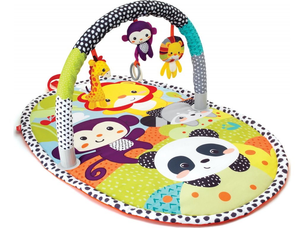 Hrací deka s krásnými ilustracemi zvířátek ze zoo. Zavěšené hračky v podobě roztomilých zvířátek lákají miminko ke zkoumání a pozorování.