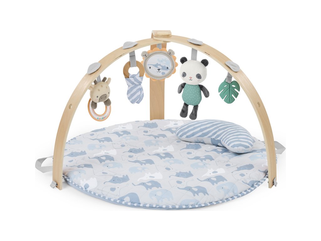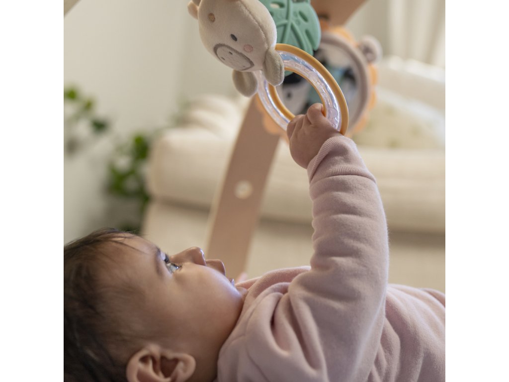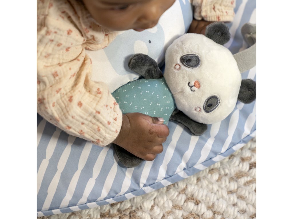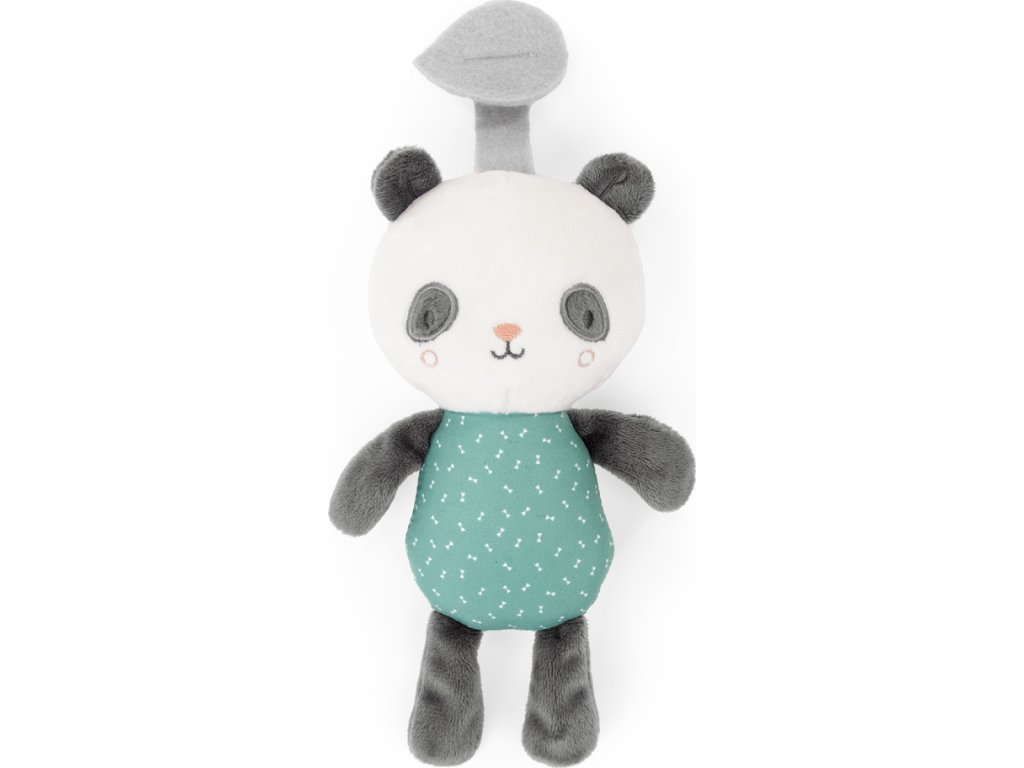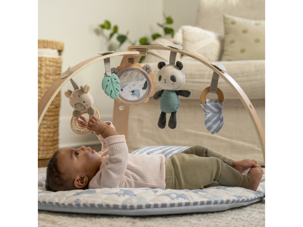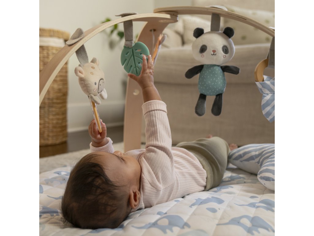 - 5 odnímatelných hraček: silikonový lístek, plyšová panda, dřevěný kroužek, zrcátko s lvíčkem a chrastítko se žirafou