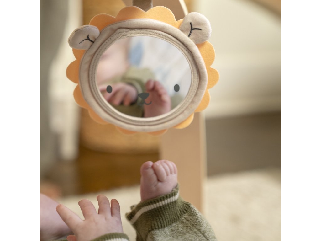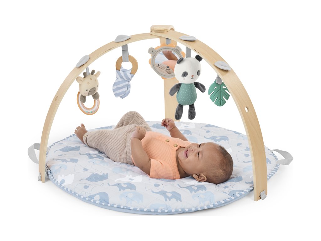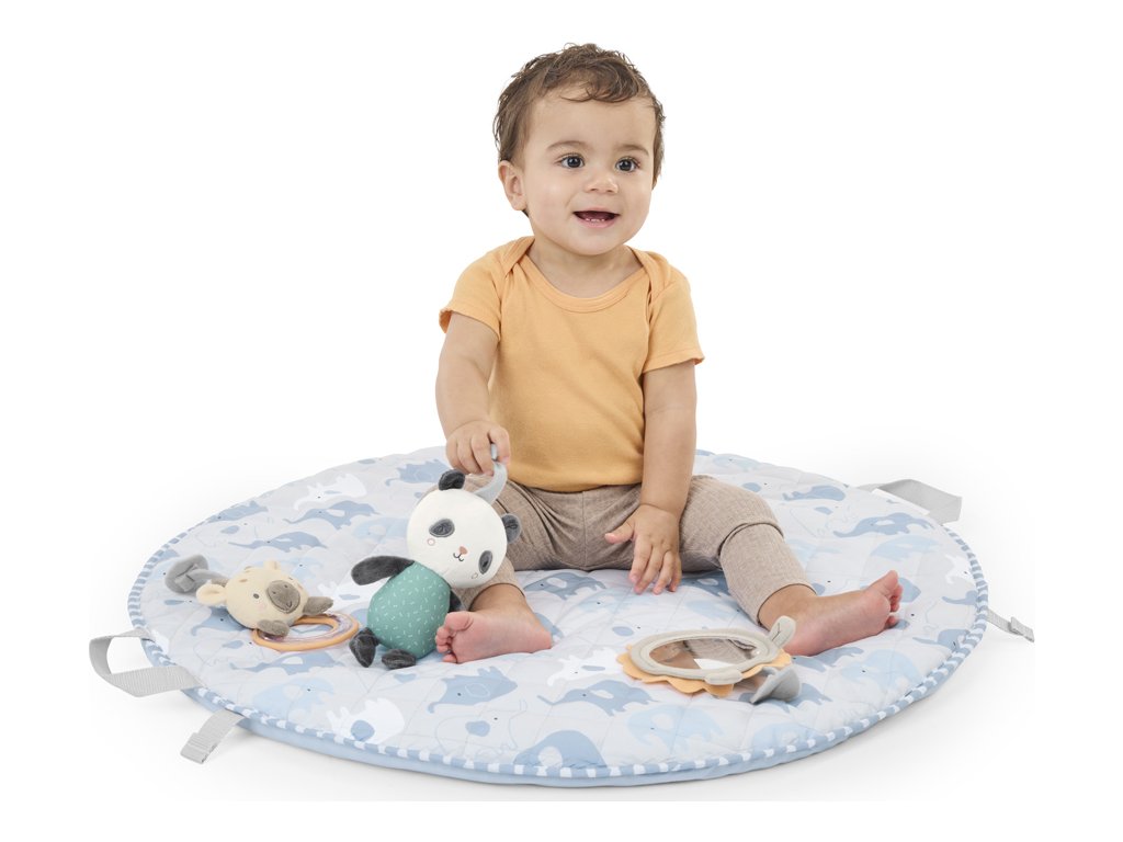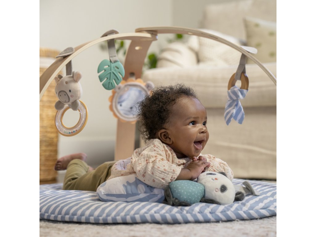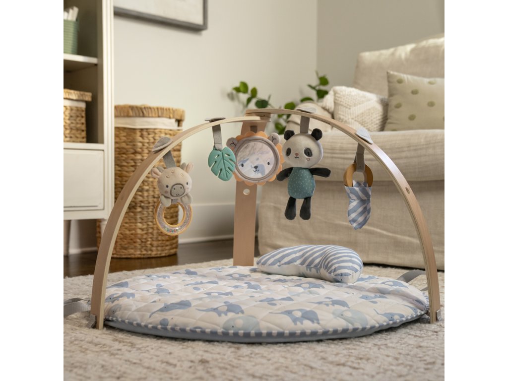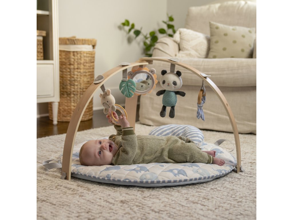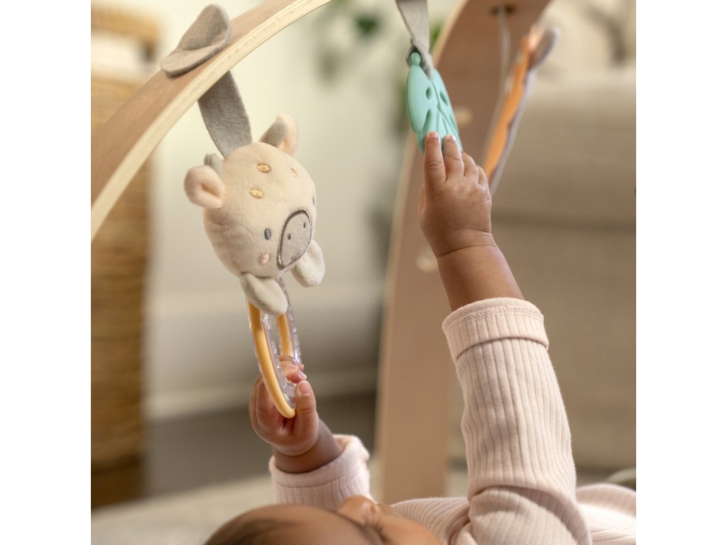 - 5 odnímatelných hraček: silikonový lístek, plyšová panda, dřevěný kroužek, zrcátko s lvíčkem a chrastítko se žirafou