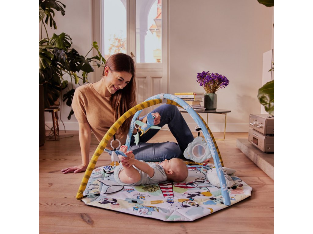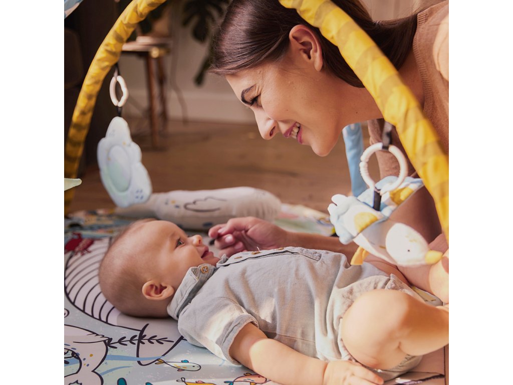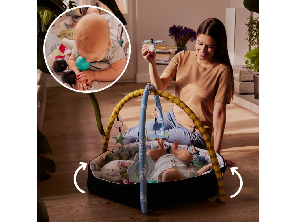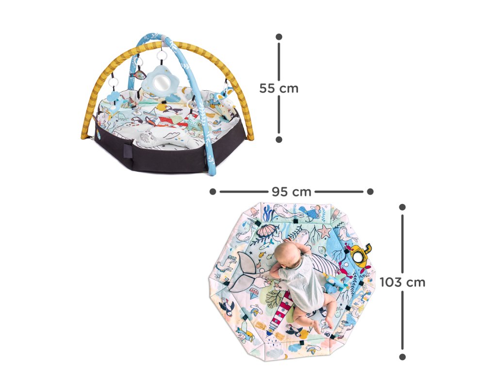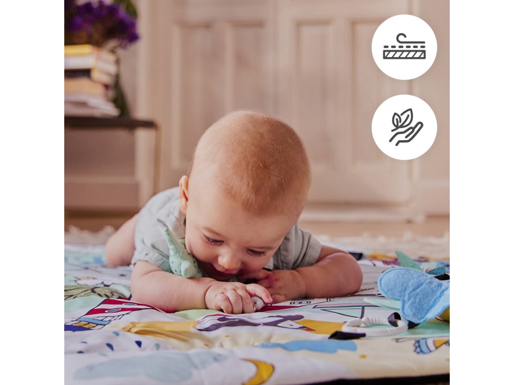 Hrací deka pro děti od narození. V sadě 7 hraček s různými estetickými a kognitivními vlastnostmi: zrcadlo, šustící kniha, 2 kousátka, pískací tygr chrastítko a zvonicí slon.
