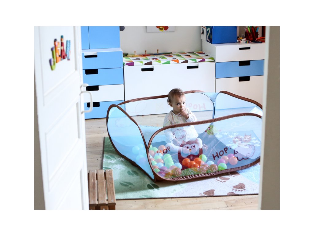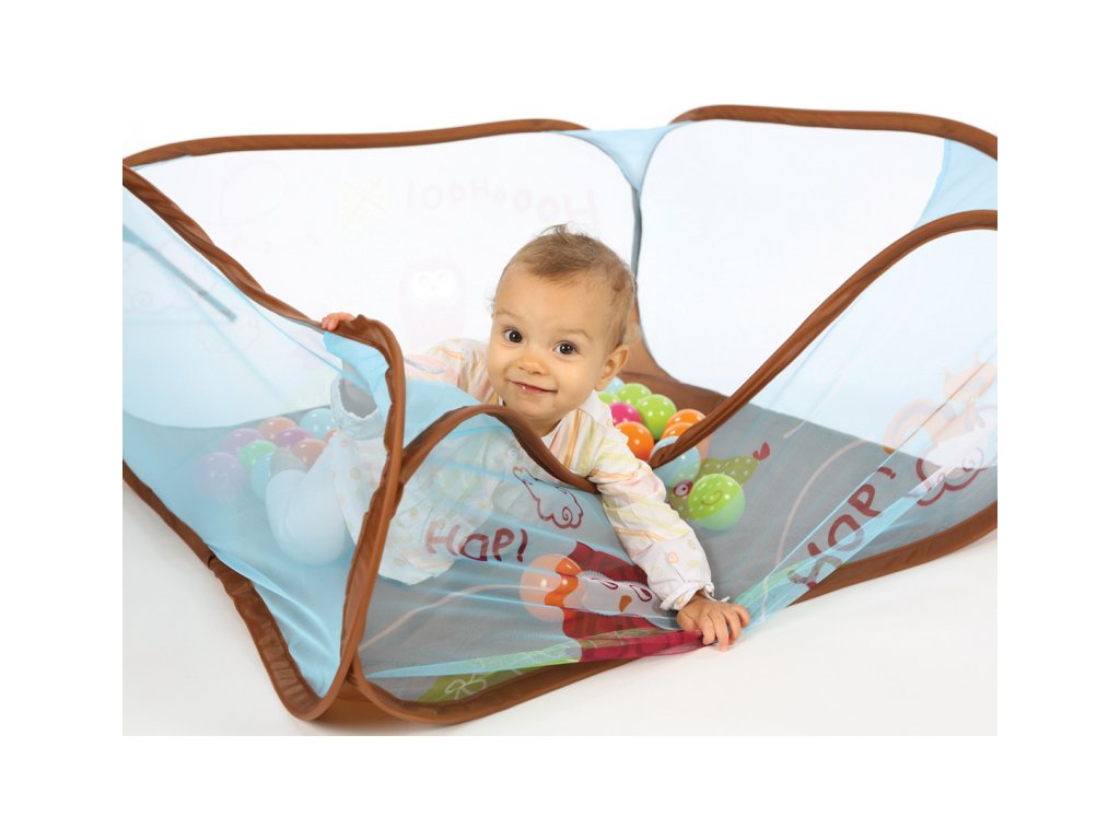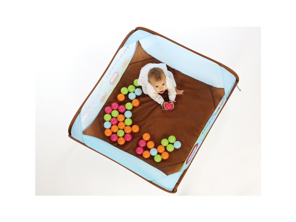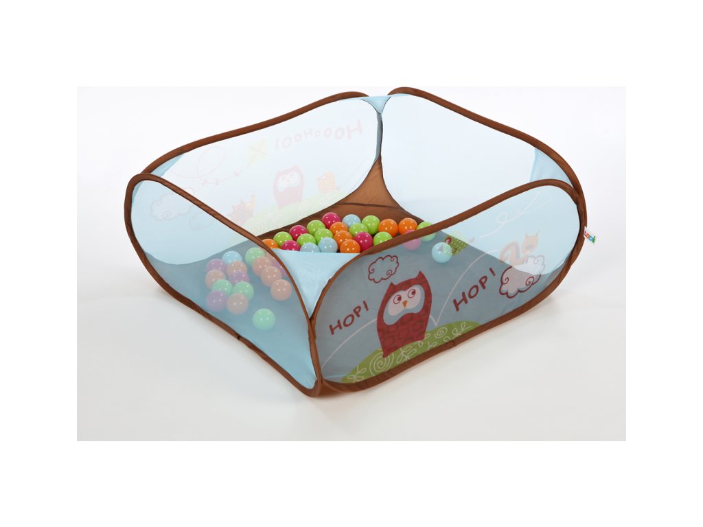 Skládací síťová ohrádka s 50 ks míčků. Síťované stěny jsou potištěné obrázky. Ohrádku Ludi je snadné složit do přiložené textilní tašky. Rozměry: 90×90×40cm. Vhodné od narození.