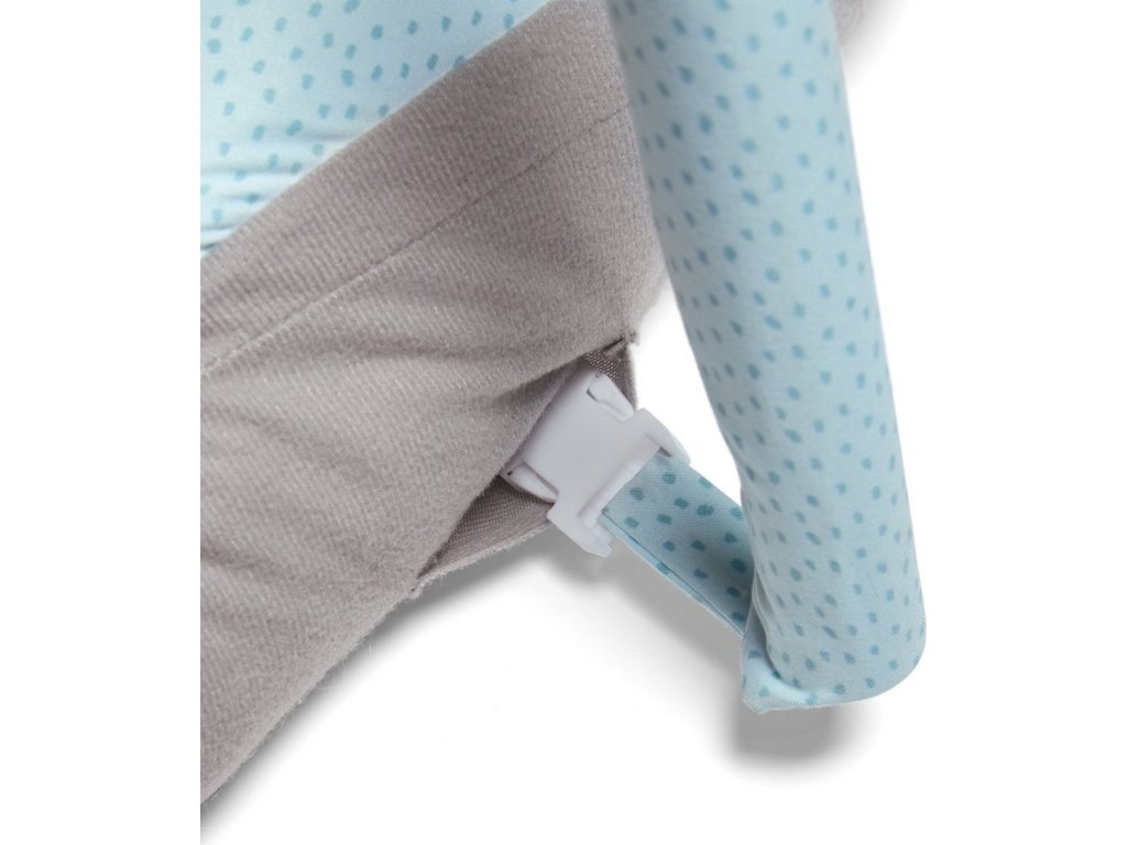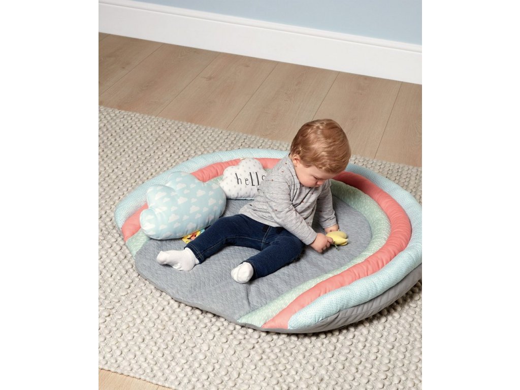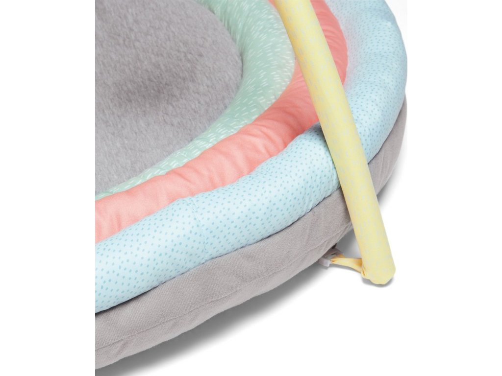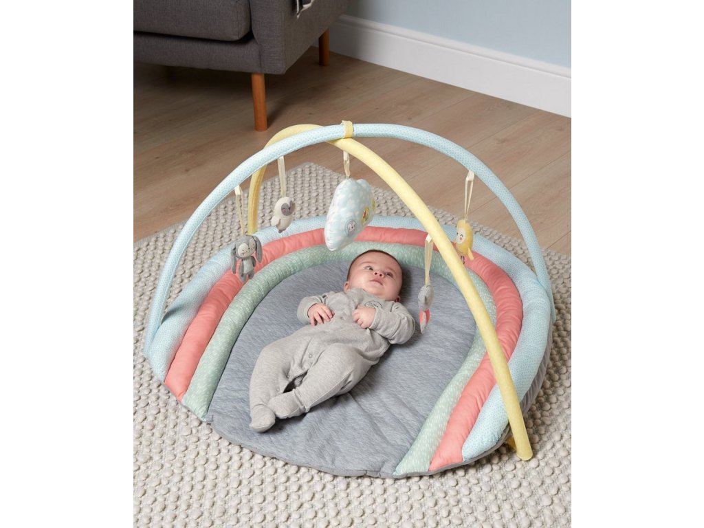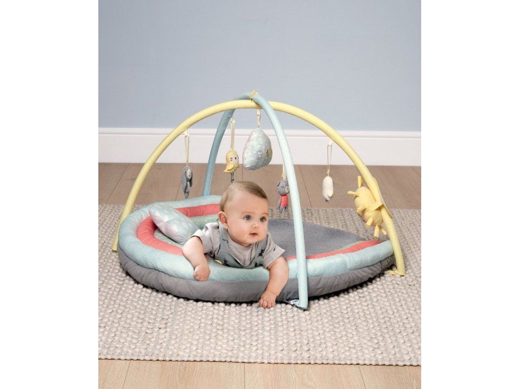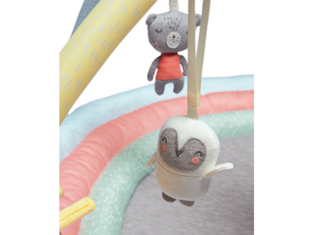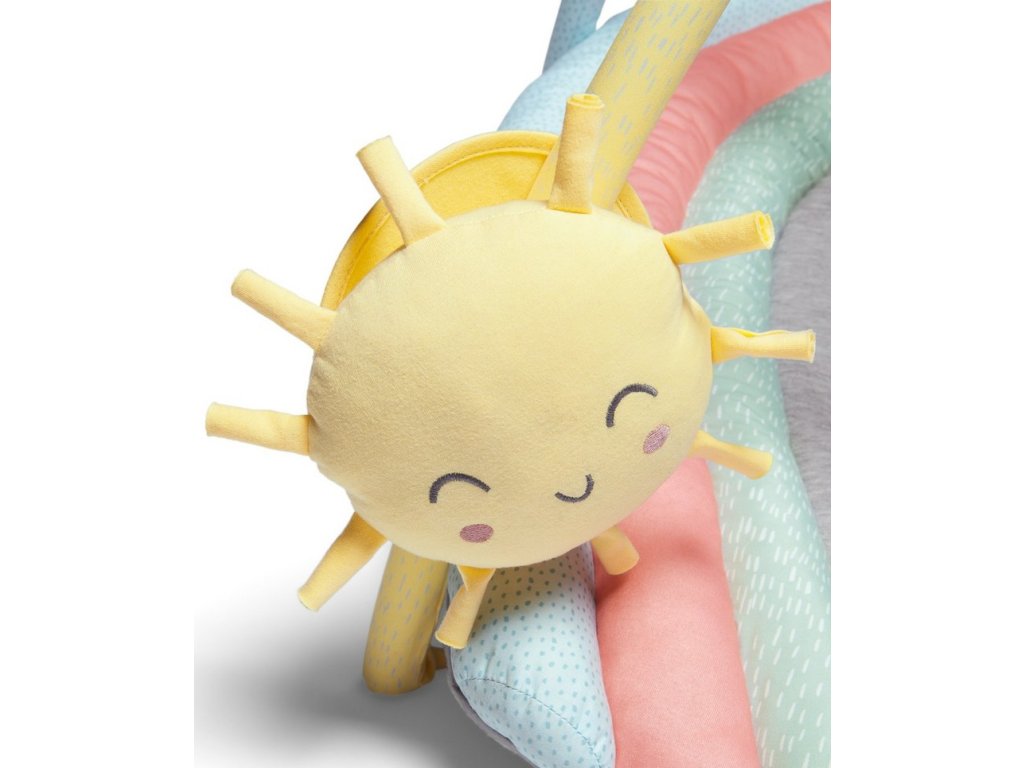 Odnímatelná hrazda se čtyřmi zavěšenými hračkami ve tvaru zvířátek a mráčkem, hrajícím 3 uklidňující melodie, zabaví miminko v poloze na zádech. Hračka ve tvaru sluníčka po zmáčknutí svítí.