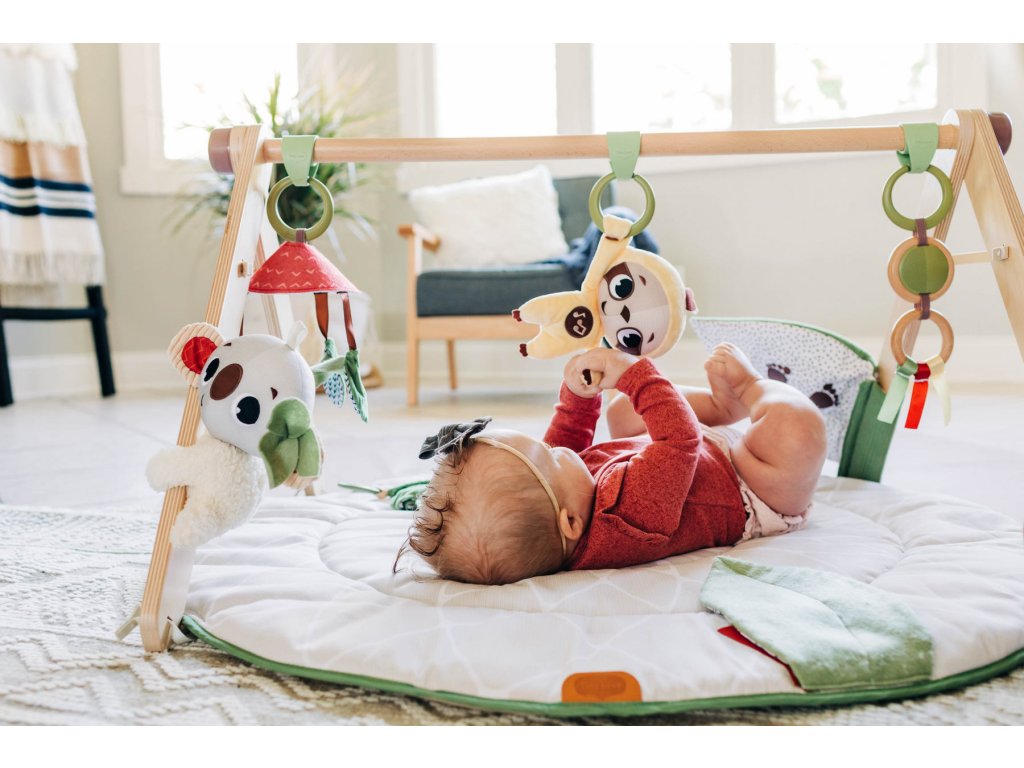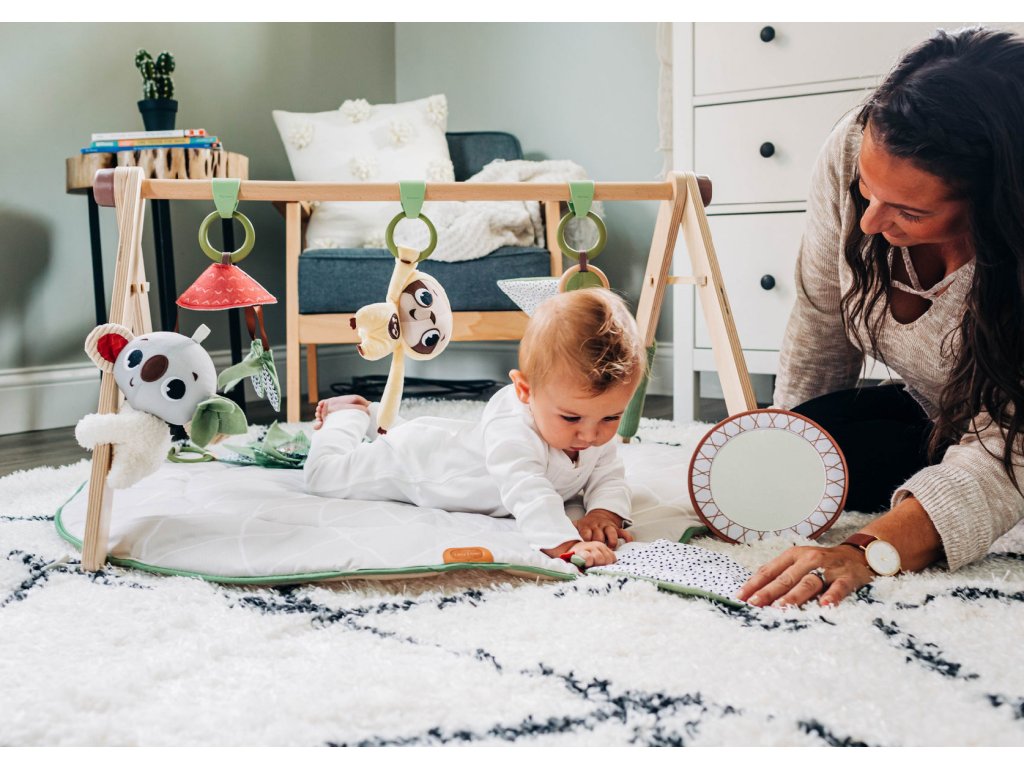 Extra měkké polstrování a jemná tkanina zajistí dítěti na dece maximální pohodlí. 20 vývojových aktivit dítě zabaví a zároveň stimuluje jeho jednotlivé smysly. Hudební hračka v podobě neodolatelného lenochoda při pohybu jemně chrastí a zmáčknutím místa na bříšku se aktivuje jedna z pěti melodií. Pozornost dítěte upoutá šplhající plyšová koala, dřevěné kroužky s chrastítkem a stužkami i eukalyptové lístky s černobílým výrazným vzorem. Velký list při pohybu chrastí, dítě do něj může kopat nožičkami. Bezpečné zrcátko i velká květina s šusticími okvětními listky a průhledným středem s korálky podněcují dítě ke hraní na bříšku. Jednotlivé závěsné hračky je možné používat i samostatně mimo deku.