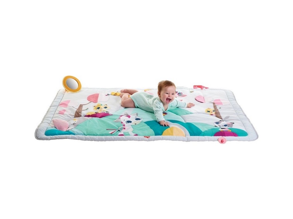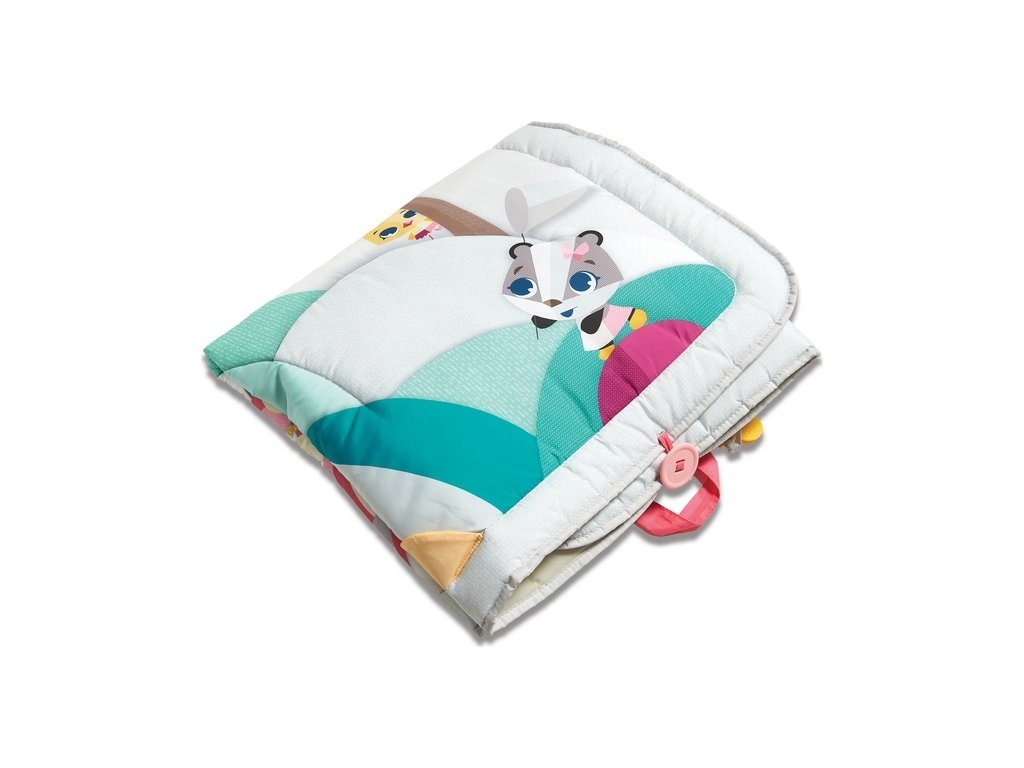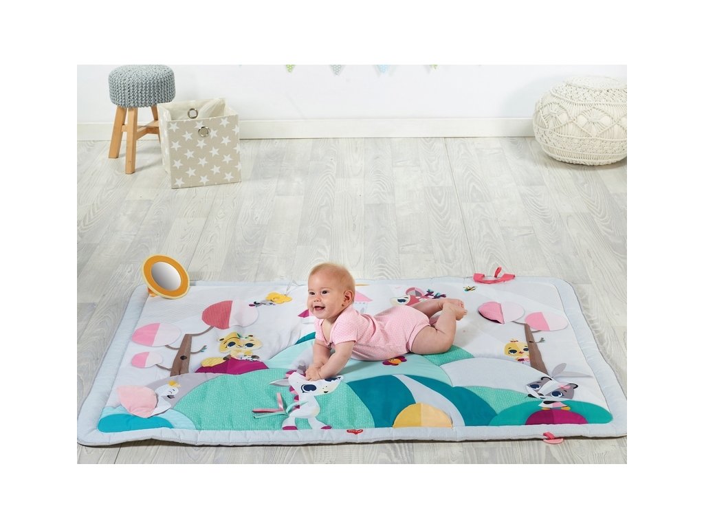 Extra velká, měkká hrací deka s krásnými ilustracemi zvířátek nabízí množství aktivit k zabavení dítěte a rozvíjení jeho smyslů a motorických dovedností: bezpečné zrcátko, kousátka, šusticí části či kroužek, umožňující připevnění dalších hraček.