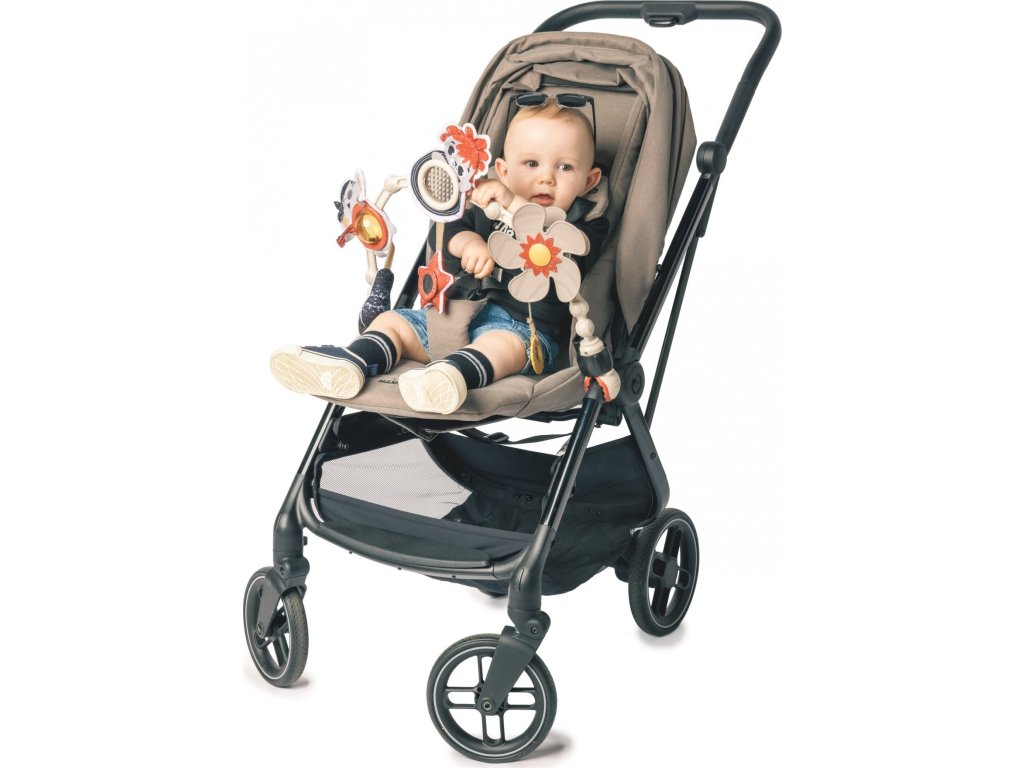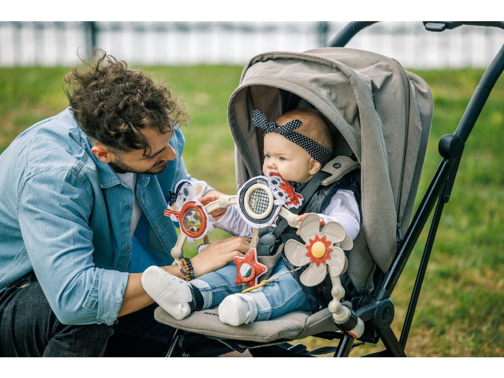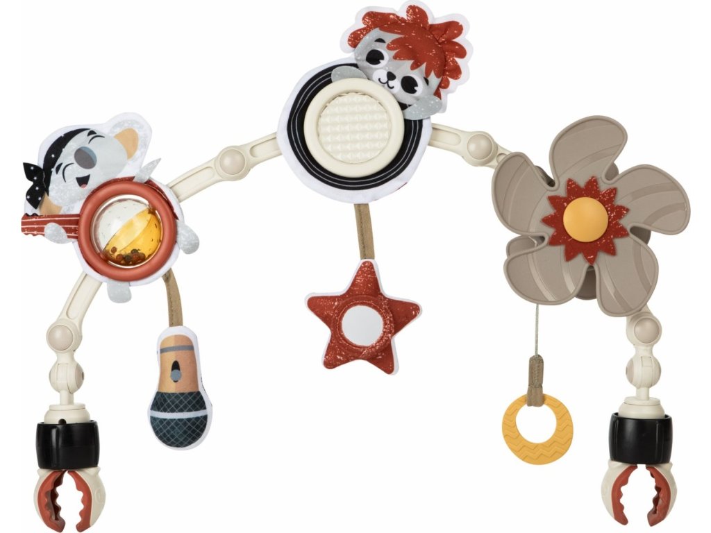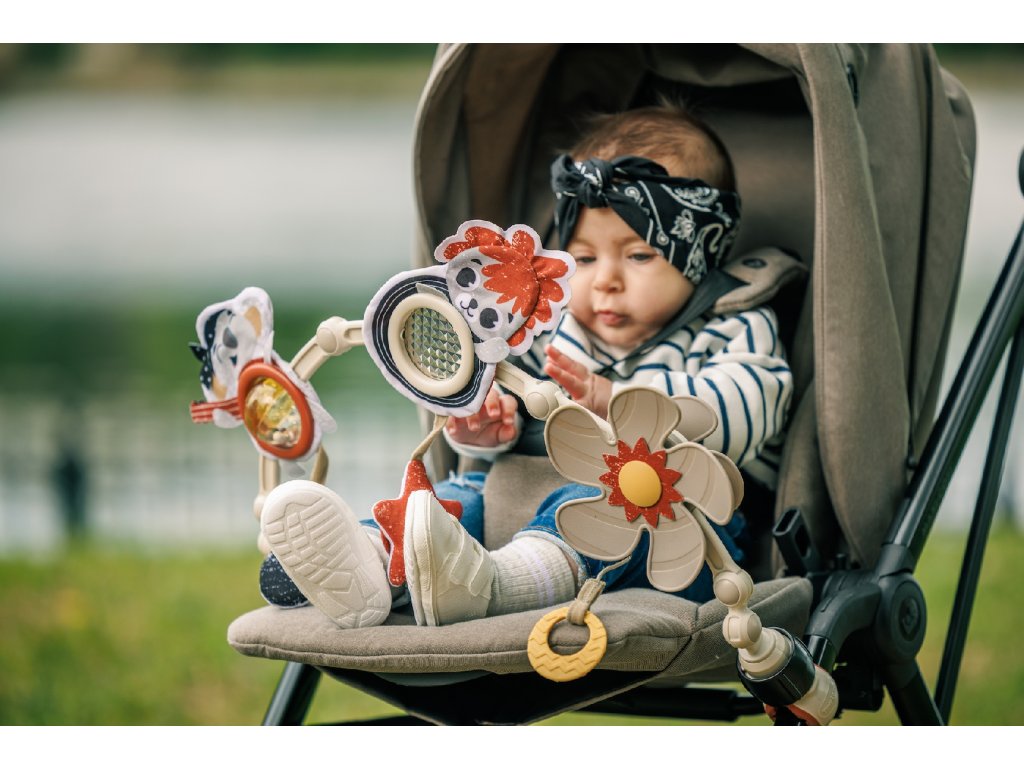 Hrazda Tiny Love je vhodná na kočárek, autosedačku či lehátko. Nabízí množství aktivit pro zabavení dítěte na cestách i doma, např. chrastítko, kousátko, otáčecí větrník nebo bezpečné zrcátko.