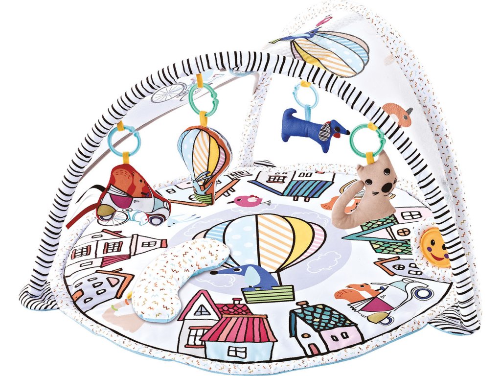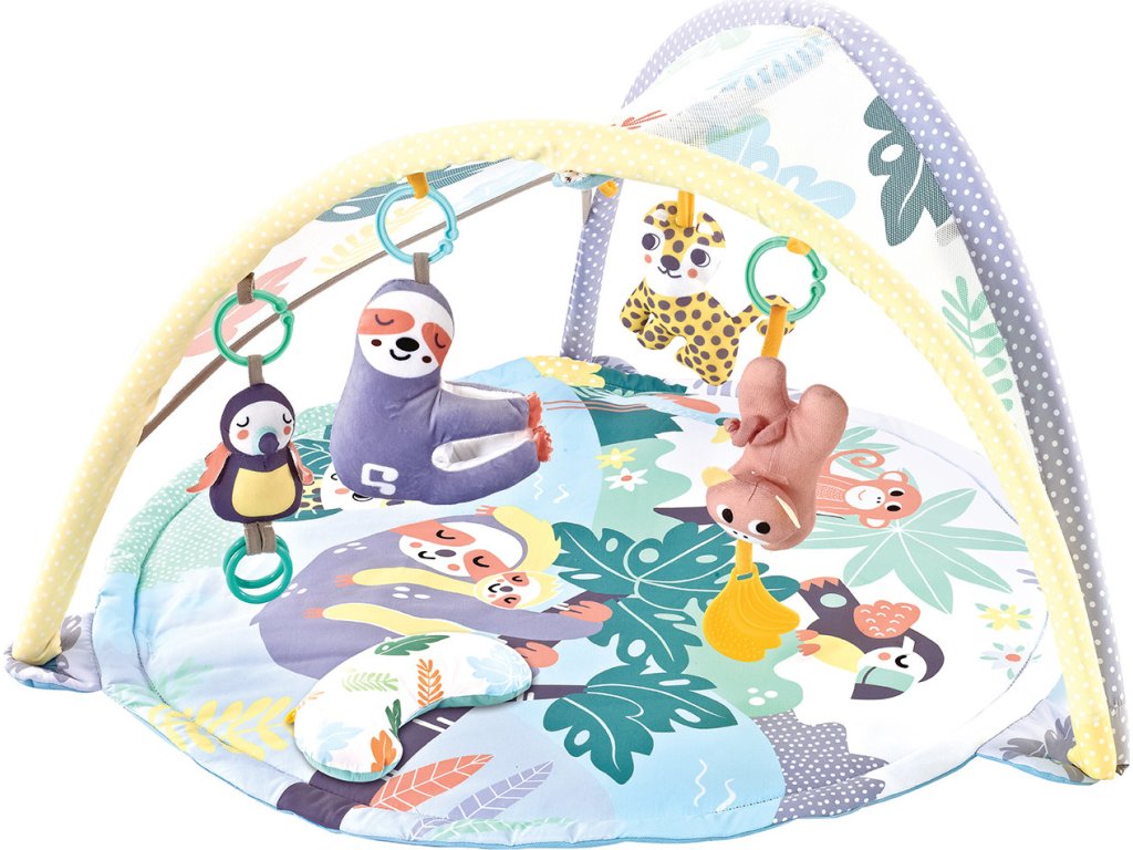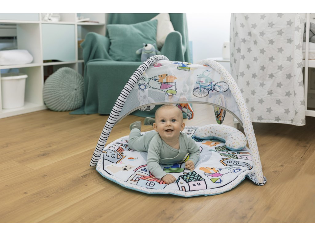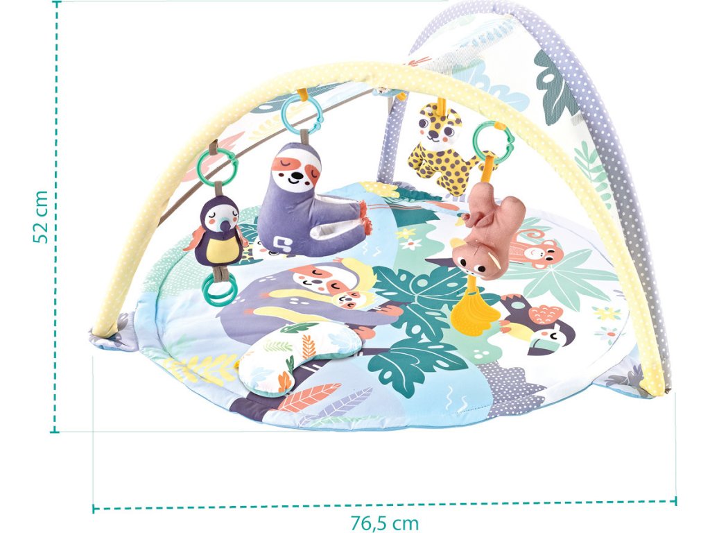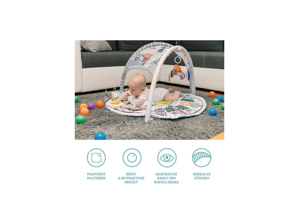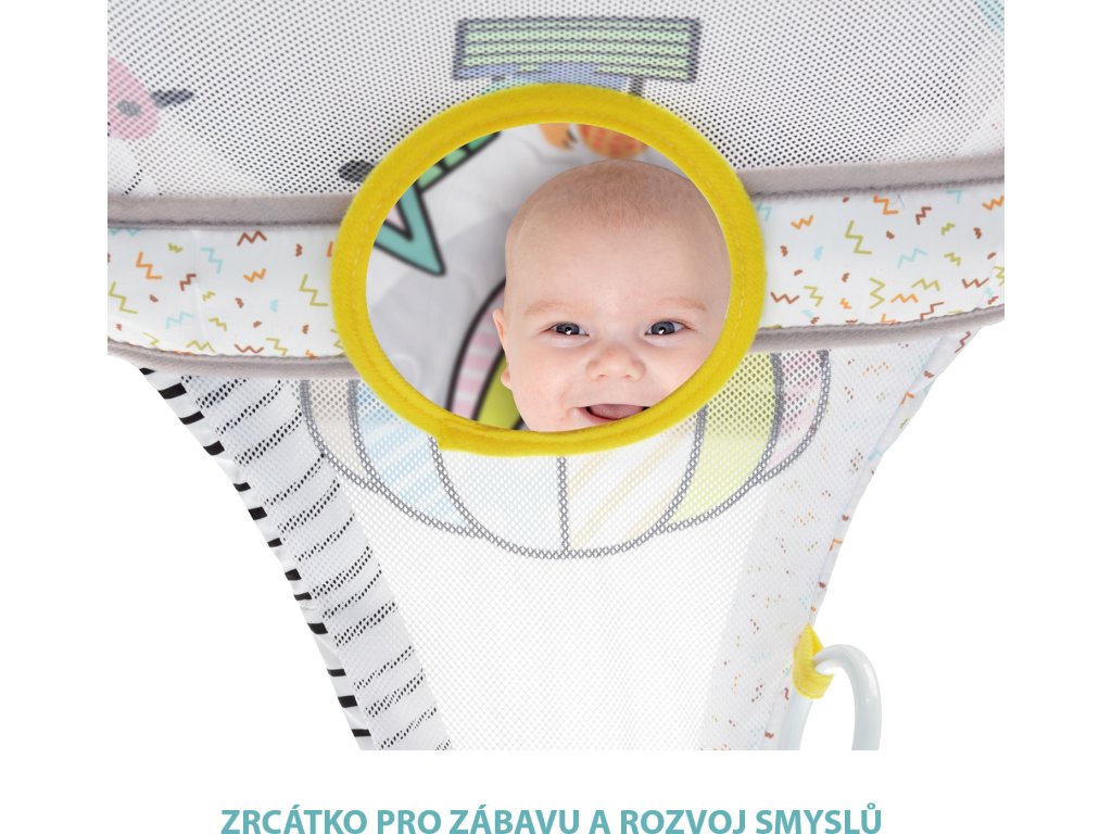 Ležící miminko zaujmou visící hračky, které ho motivují po nich sáhnout, aby je rozhoupaly a rozcinkaly. Děťátko tak trénuje své psychomotorické dovednosti. Pro uklidnění lze pustit příjemnou melodii z jedné ze závěsných hraček.