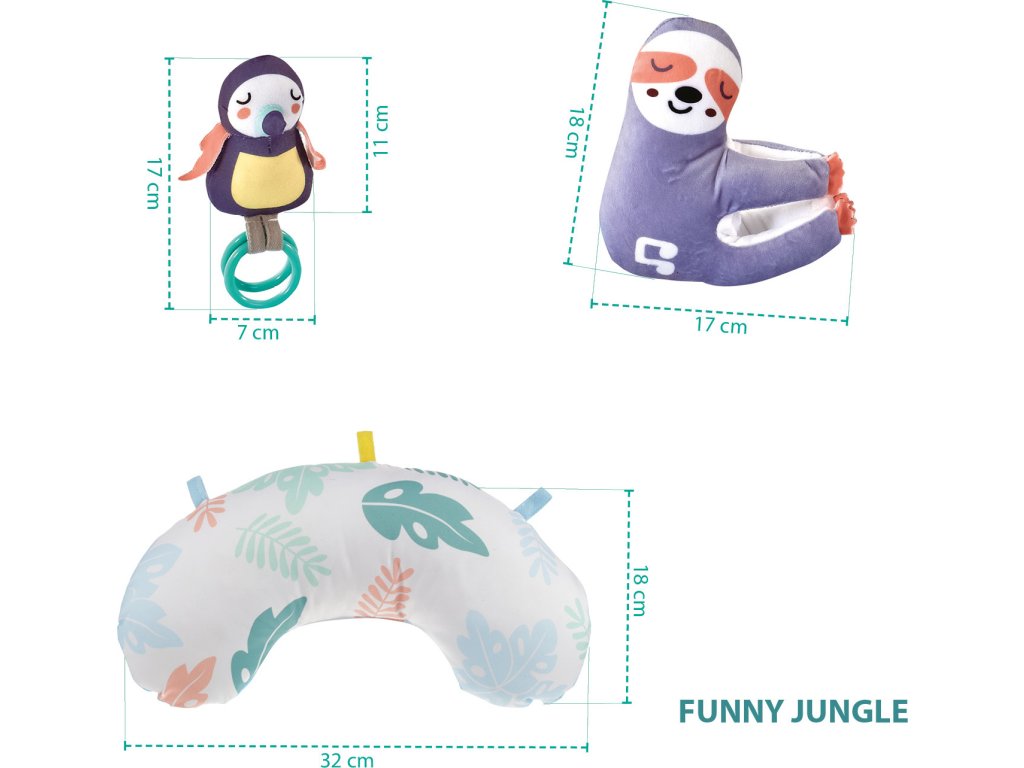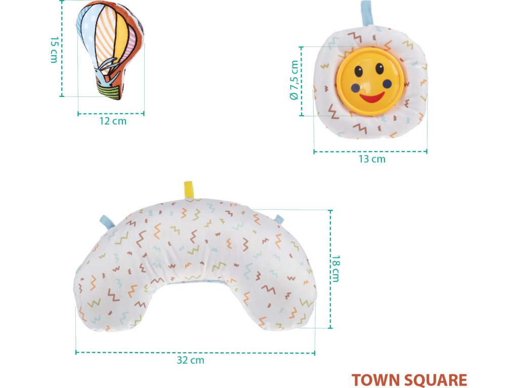 Součástí aktivity deky je tvarovaný polštářek, který se stane skvělým pomocníkem při „pasení koníčků“. Děti díky němu získají potřebnou oporu. Na polštářek lze připojit závěsné hračky, díky poutkům nebudou děťátku nikam utíkat, ale motivují ho ke správnému držení tělíčka. Polštářek později využijete také při tréninku lezení, kdy jej dáte děťátku pod bříško.