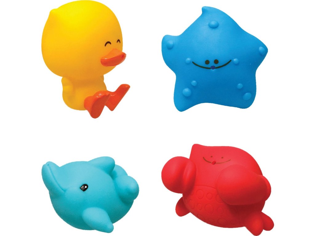 - čtyři pískací a stříkací měkké hračky (delfín, kachnička, hvězdice a krab)