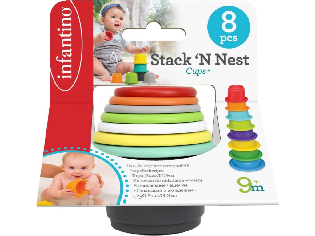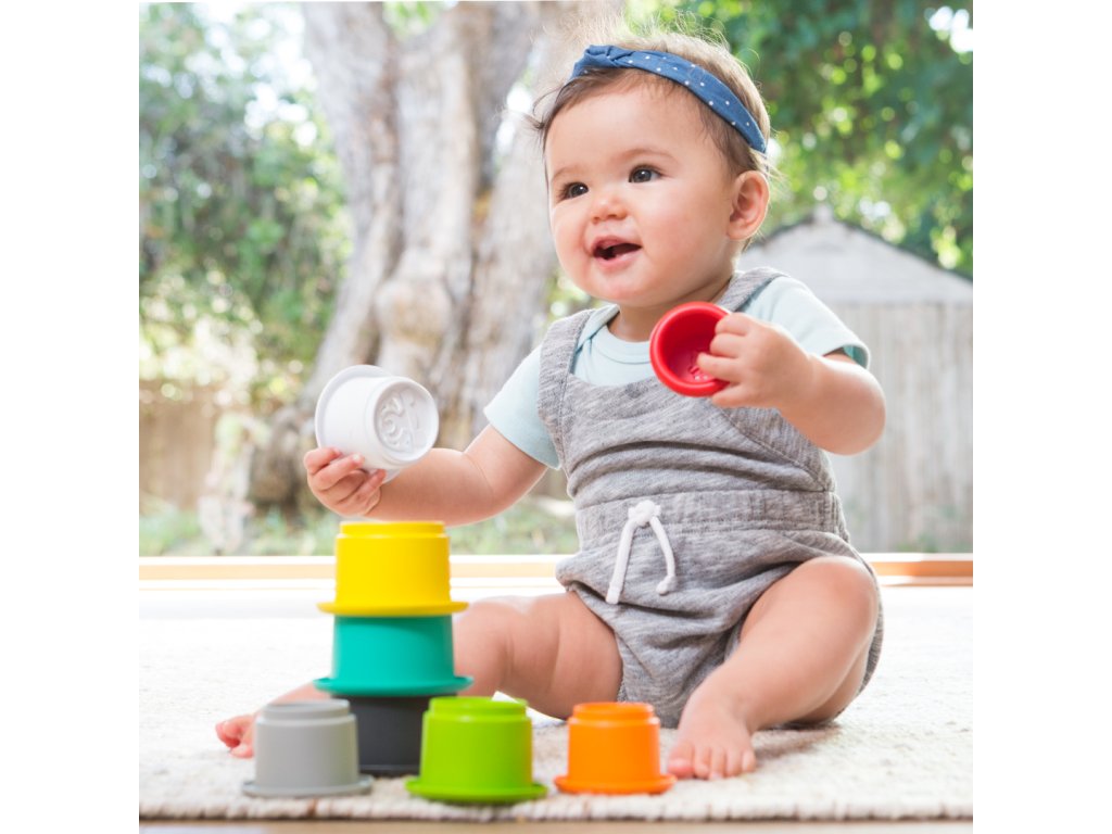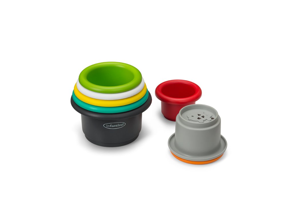 Osm různobarevných kelímků v originálním provedení má perforované dno s plastickým obrázkem zvířátka. Naučte dítě stavět z kelímků vysokou věž, kterou potom může jedním mávnutím ruky zase zbourat, poznávejte spolu zvířátka i barvy a nebo kelímky využijte pro hraní s vodou během koupele.