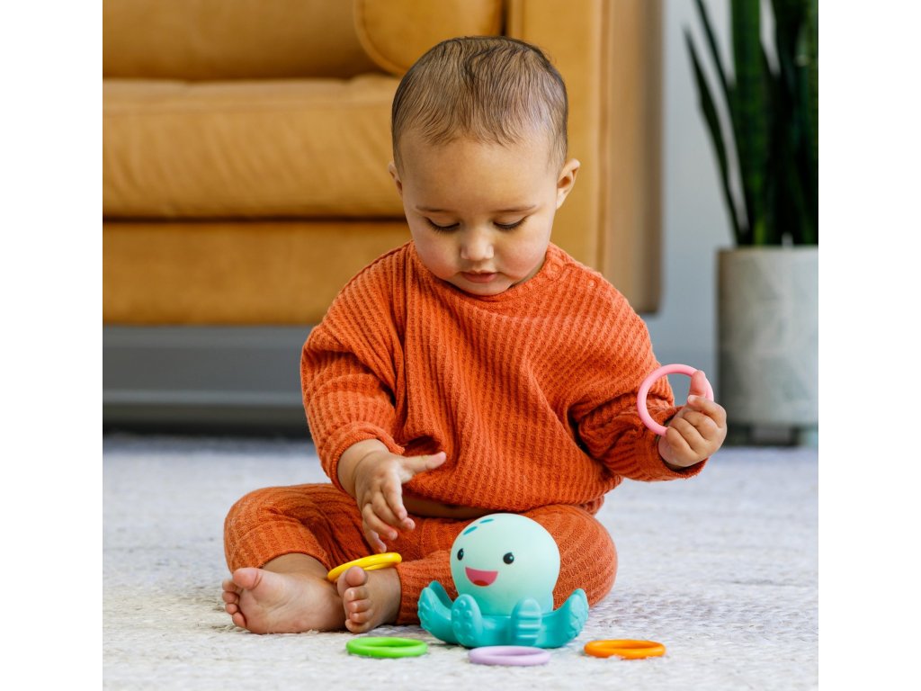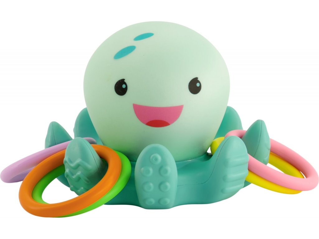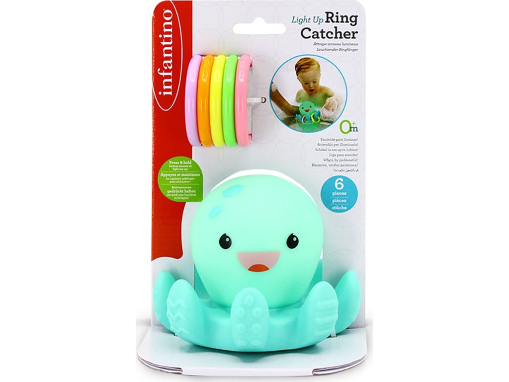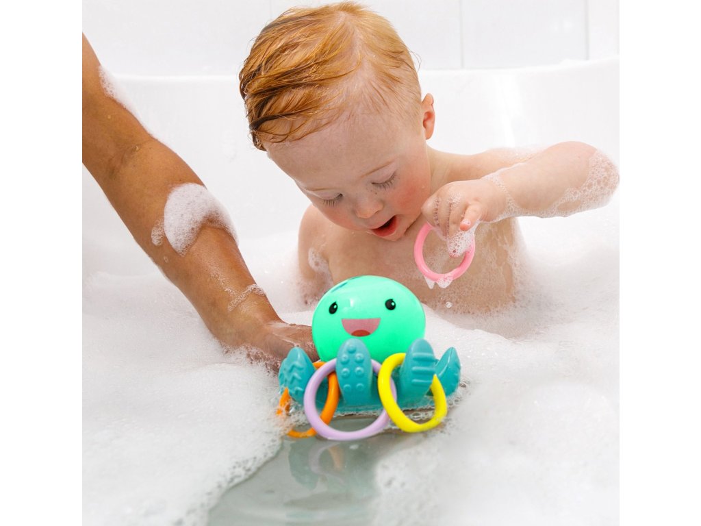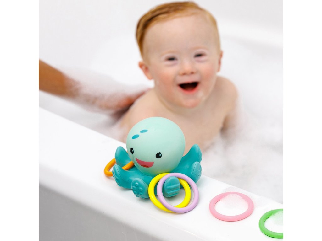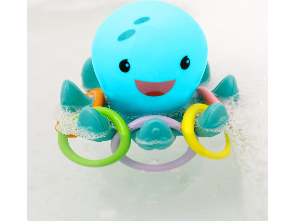 Neodolatelná hračka do koupele v podobě usměvavé chobotnice bude bavit vás i vaše děti. Hračka po vložení do vody svítí a mění barvy, rozsvítit ji můžete i stisknutím senzorů na spodní straně. Součástí hračky je i 5 barevných kroužků, které je možné navlékat na chapadla chobotnice.