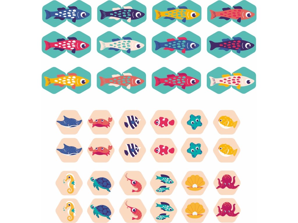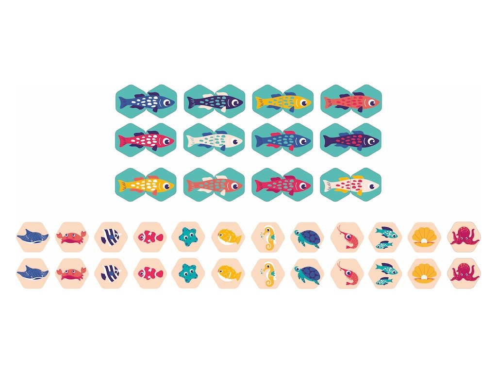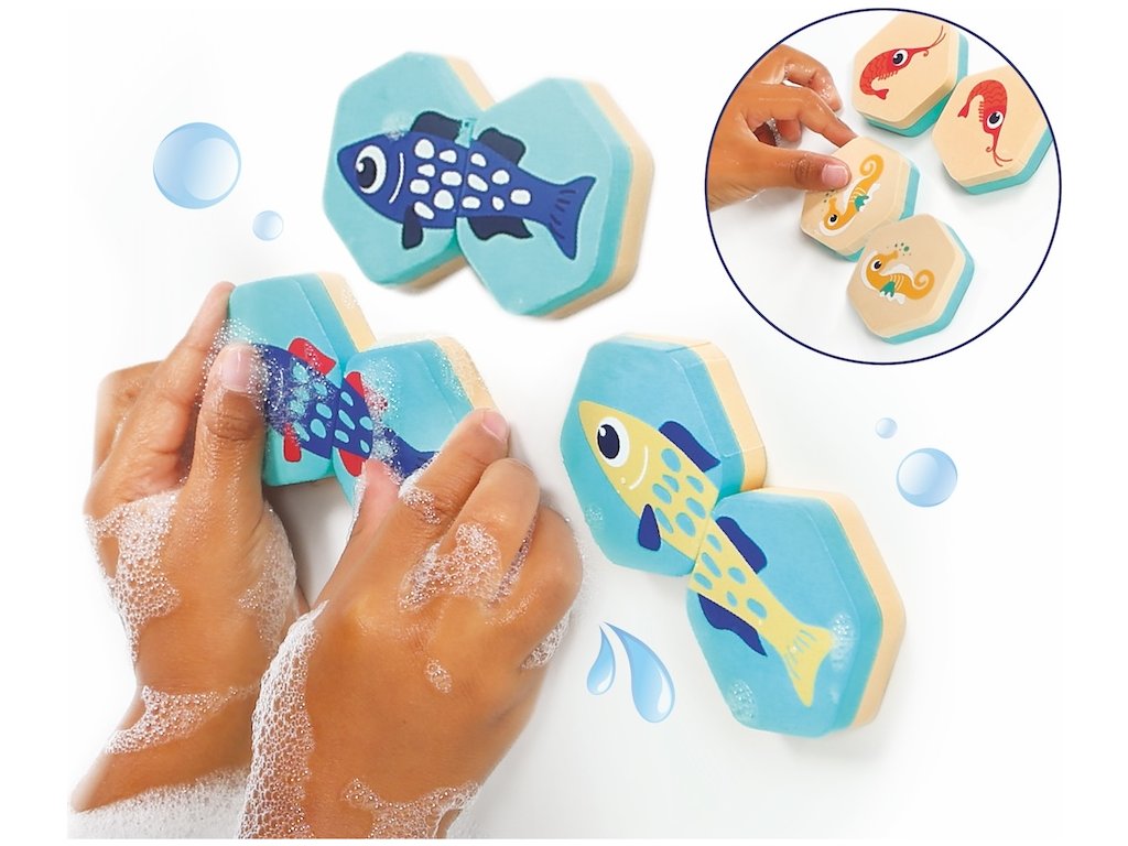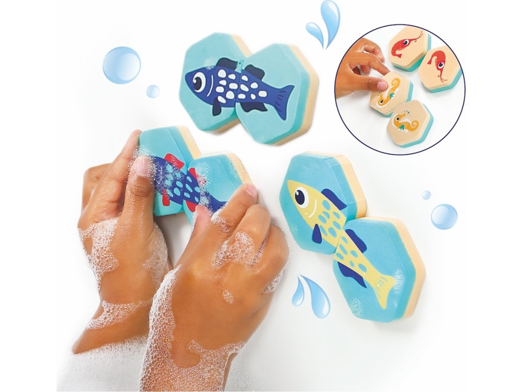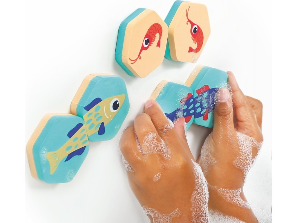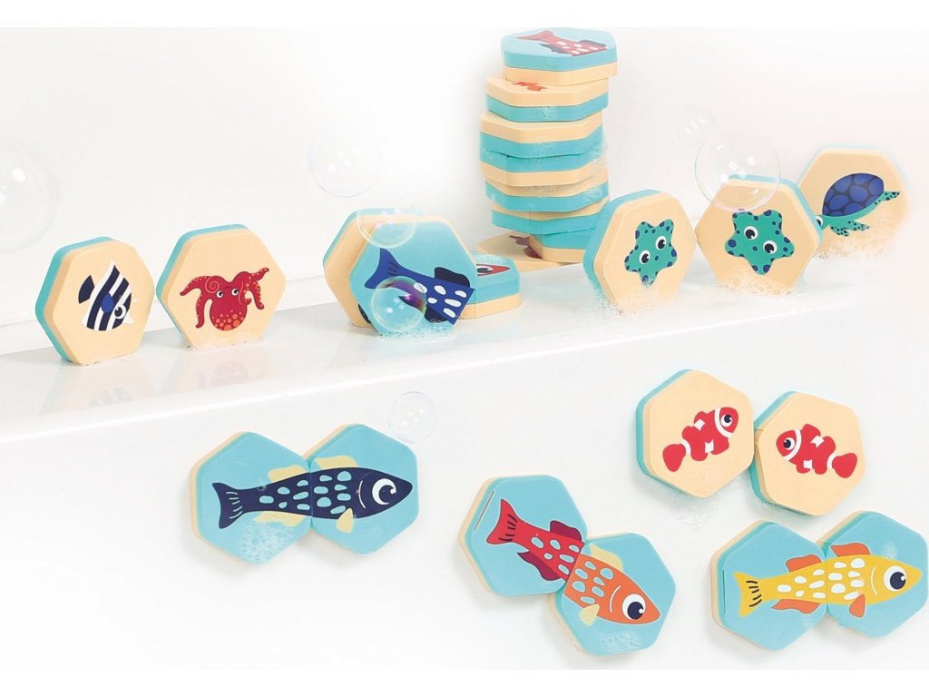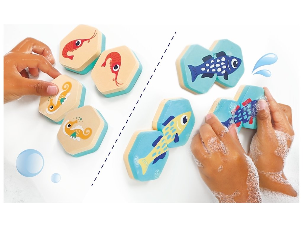 Oboustranné kartičky nabízí dvě varianty hry - klasické pexeso a jednoduchá puzzle hra, při které dítě hledá dva díly, které spolu tvoří barevnou rybičku. Vyhrané dvojice i složené rybičky si dítě může nalepit na stěnu vany.