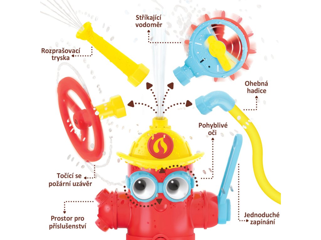 Požární hydrant, ohebná hadice, rozprašovací tryska, točící se požární uzávěr, stříkající vodoměr.