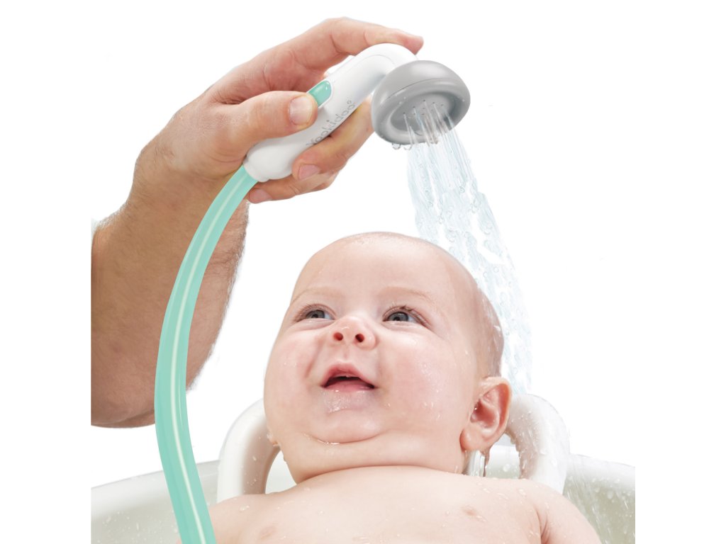 Kompaktní bateriová přenosná sprcha s jemným proudem je určena pro snadnou manipulaci při koupání dětí.