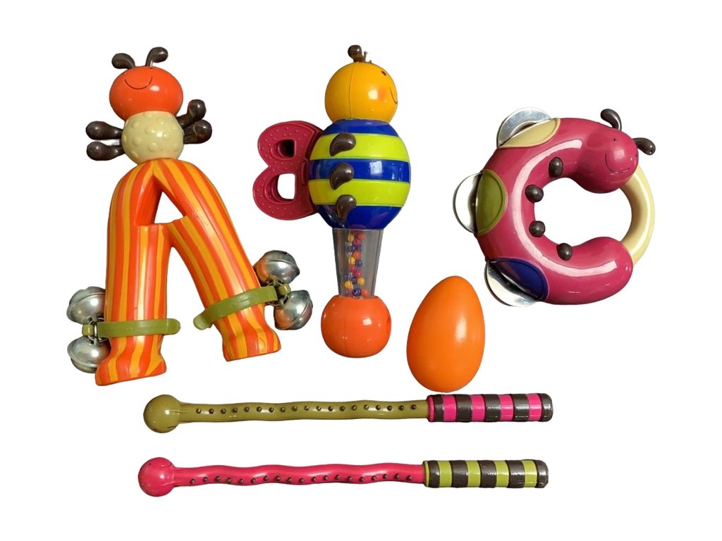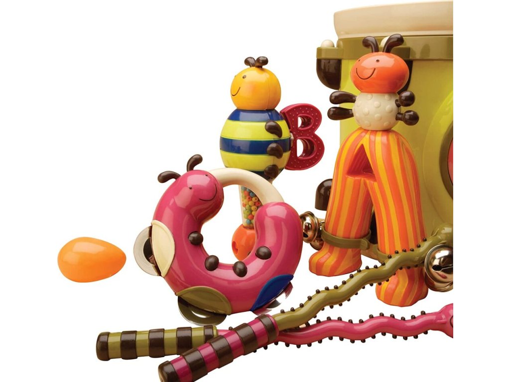 Sada hudebních nástrojů pro nejmenší Parum Pum Pum obsahuje 6 různých instrumentů (bubínek, dvě paličky, tamburínu, chrasticí vajíčko, mravence s rolničkami, chrasticí a klapací včelku). Držadlo bubínku, do kterého můžete všechny ostatní hudební nástroje ukládat, usnadňuje přenášení.