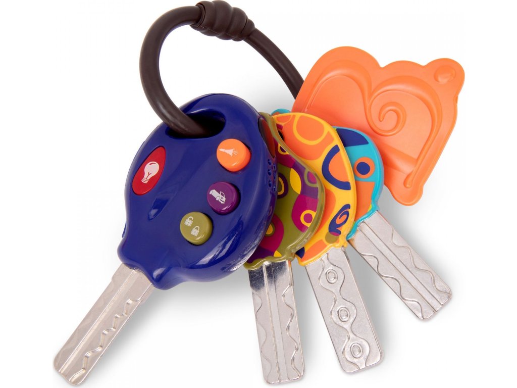 Čtyři klíčky jako od opravdového auta na kroužku s přívěskem. Jeden z klíčků má ovladač se třemi různými zvuky a světýlkem. Odolný materiál bezpečný pro zkoumání rukou i ústy.