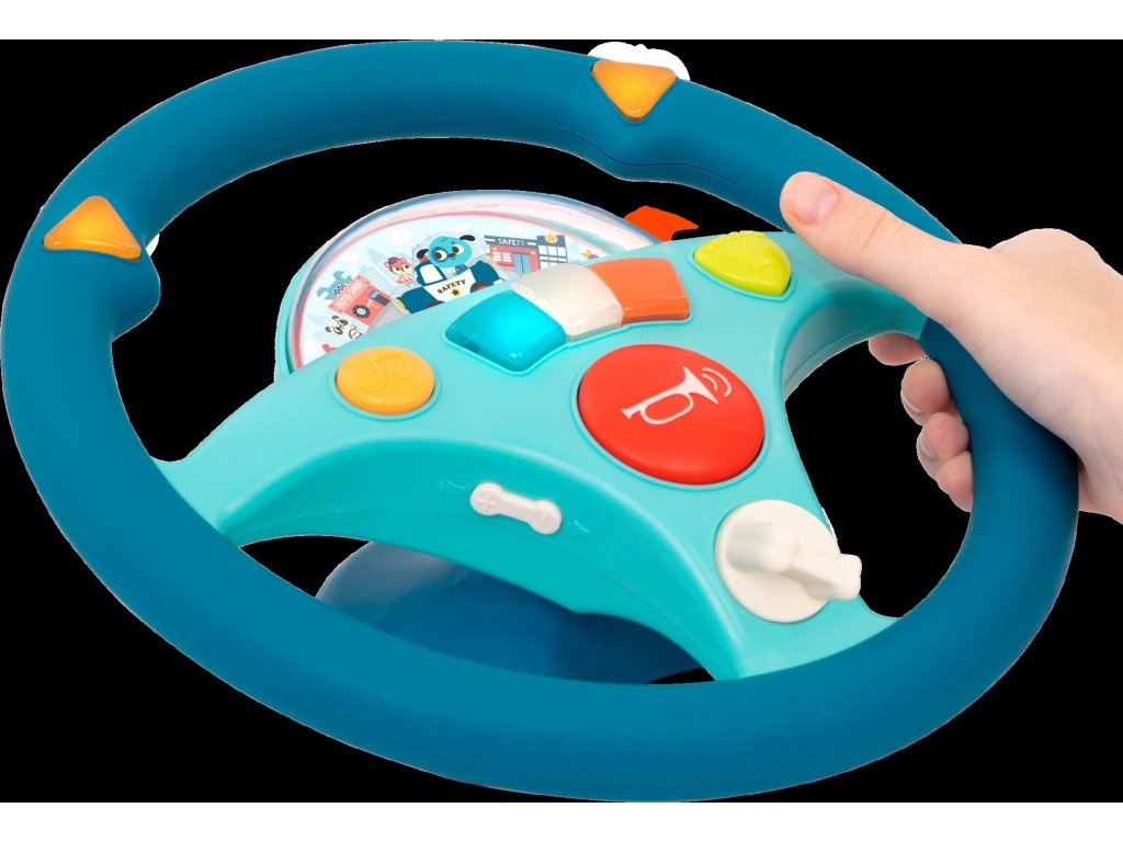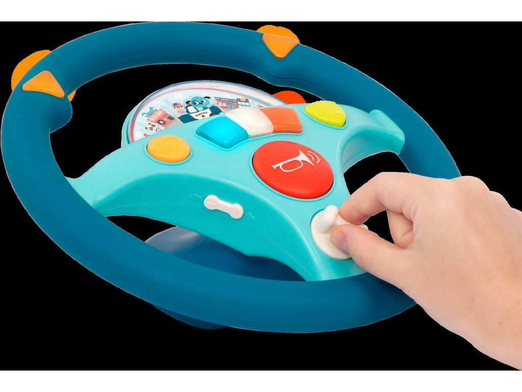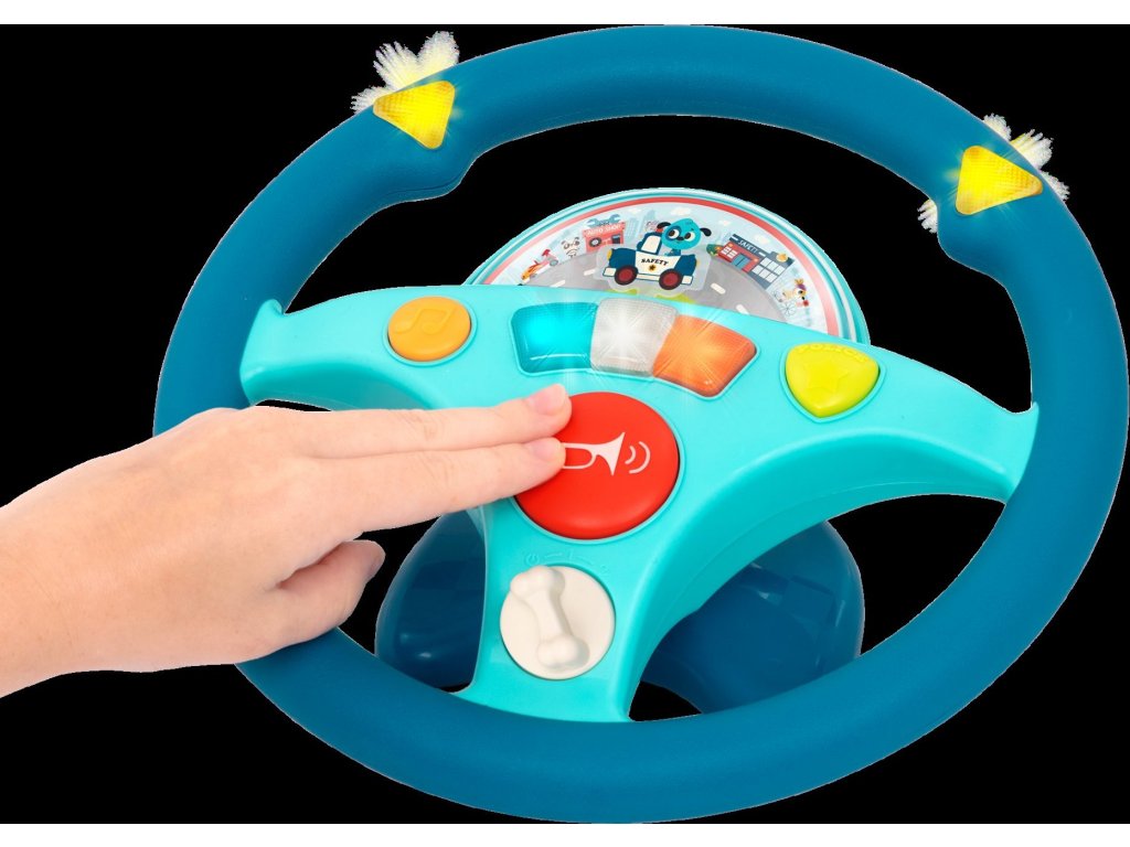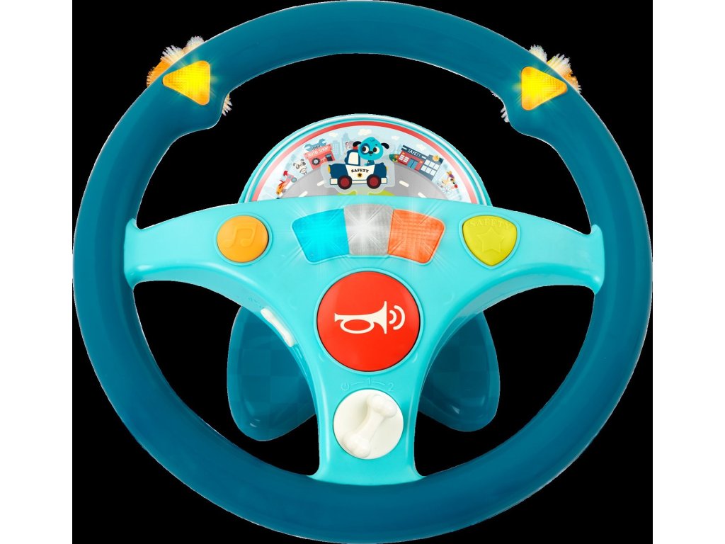 Interaktivní volant pro malého řidiče je ideální hračkou do autosedačky. Malý řidič může otáčením volantu pouštět blinkry. K řízení si může pustit písničku. Volant vydává i zvuky motoru a je vybaven houkačkou. Pod průhledným krytem je malé autíčko a pohybující se ulice města, autíčko ulicí jede dopředu nebo couvá.