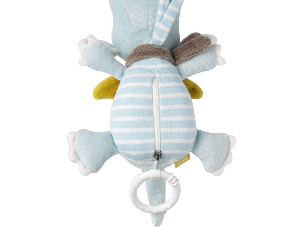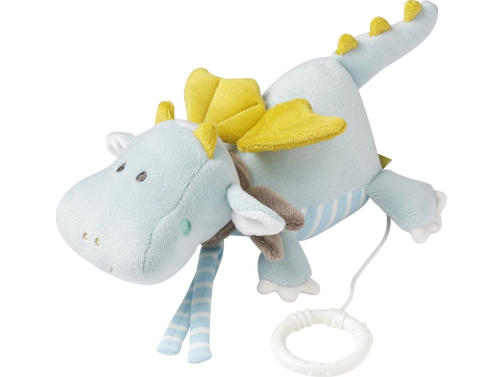 Malý hudební box ve tvaru letícího draka s vyjímatelným hudebním mechanismem. Hračka je vyrobena z měkkých, příjemných materiálů, které vybízejí k doteku a mazlení. Letící netopýrek má na zádech zip, kterým můžete vyjmout hrací strojek. Ve spodní části hračky je šňůrka s kroužkem, který se snadno ovládá. Zatáhnutím spustíte ukolébavku. Netopýr se dá snadno připevnit pomocí uvazovacích šňůrek.