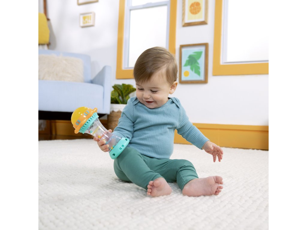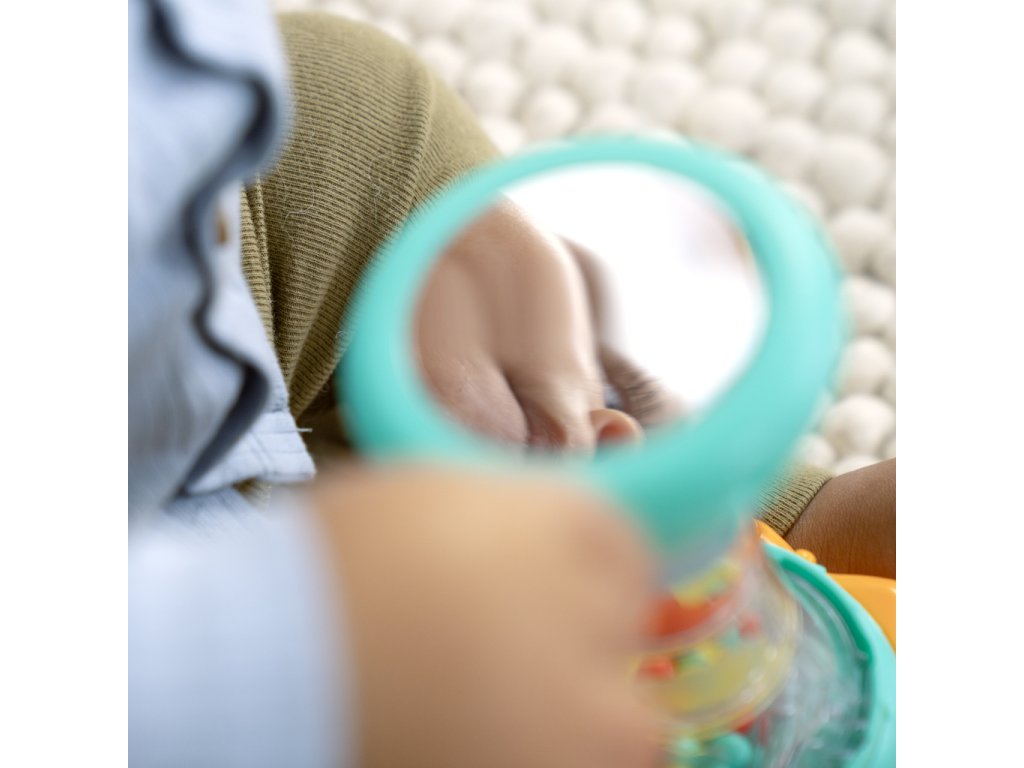 Svítící hračka zabaví miminko veselými světly, zvuky zvířátek a chrastícími kuličkami. Otáčej sluneční kopuli, která svítí, a objev více než 30 melodií a zvuků – od mňoukání, přes rýlení až po kvákání a další. Při potřesení se kuličky uvnitř rozkutálejí jako kapky deště, čímž dítě získává další vizuální i zvukovou stimulaci. Spodní strana hračky skrývá zrcátko, které podporuje vnímání vlastního odrazu a sebeobjevování. Tato interaktivní hračka pomáhá dětem pochopit princip příčiny a následku a je ideálním společníkem na doma i na cesty.