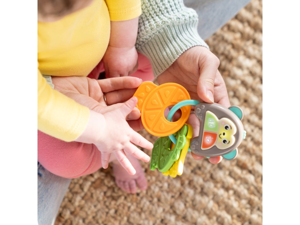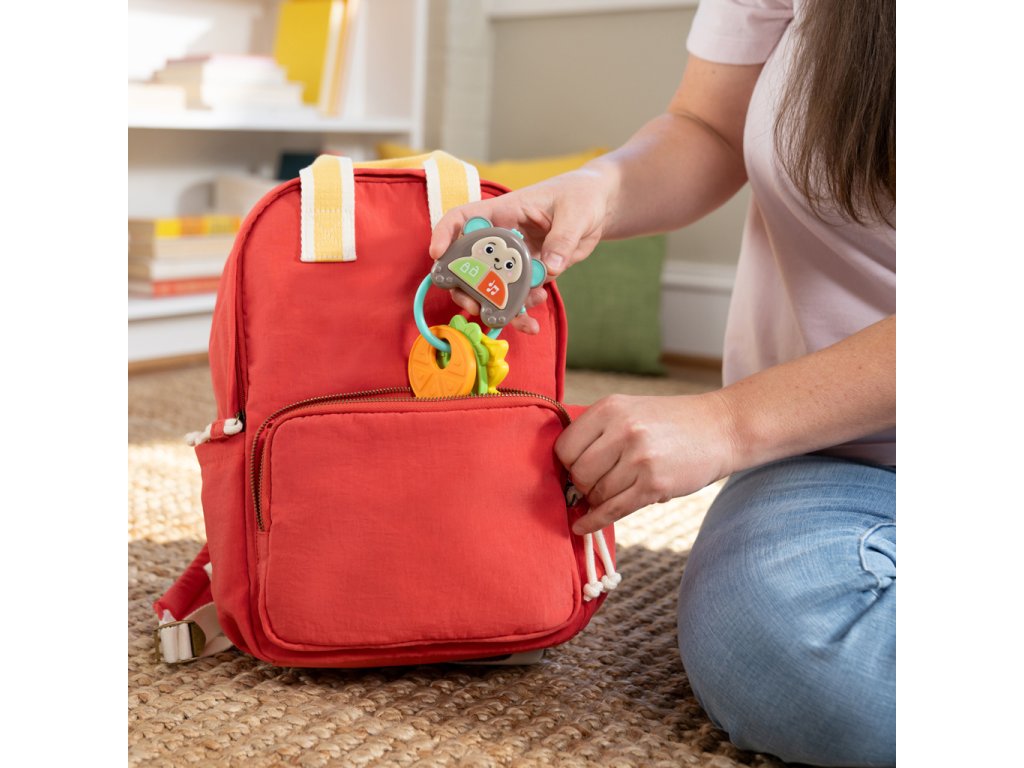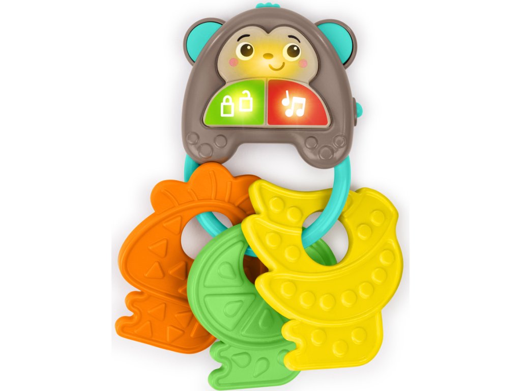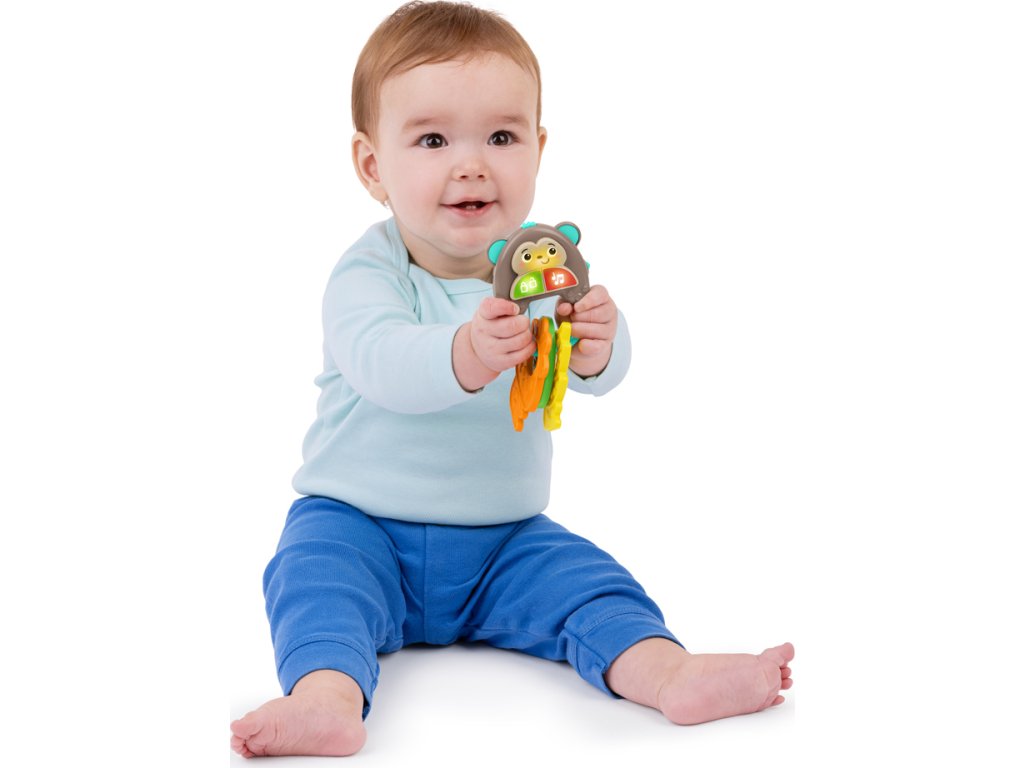 Zábavná hračka umožní děťátku cítit se a dělat věci jako máma a táta s vlastní sadou klíčů. Obsahuje více než 10 veselých zvuků aut, světel a melodií, které podněcují smysly a rozvíjejí motorické schopnosti. Tato interaktivní hračka je ideální pro doma i na cesty. Obsahuje milého opičího kamaráda, tři barevná tlačítka a texturované klíče ve tvaru ovoce. Pomáhá rozvíjet hmat, sluch a zrak miminka a podporuje učení se příčiny a následku. Hračka je lehká, přenosná a vejde se do většiny tašek na pleny.