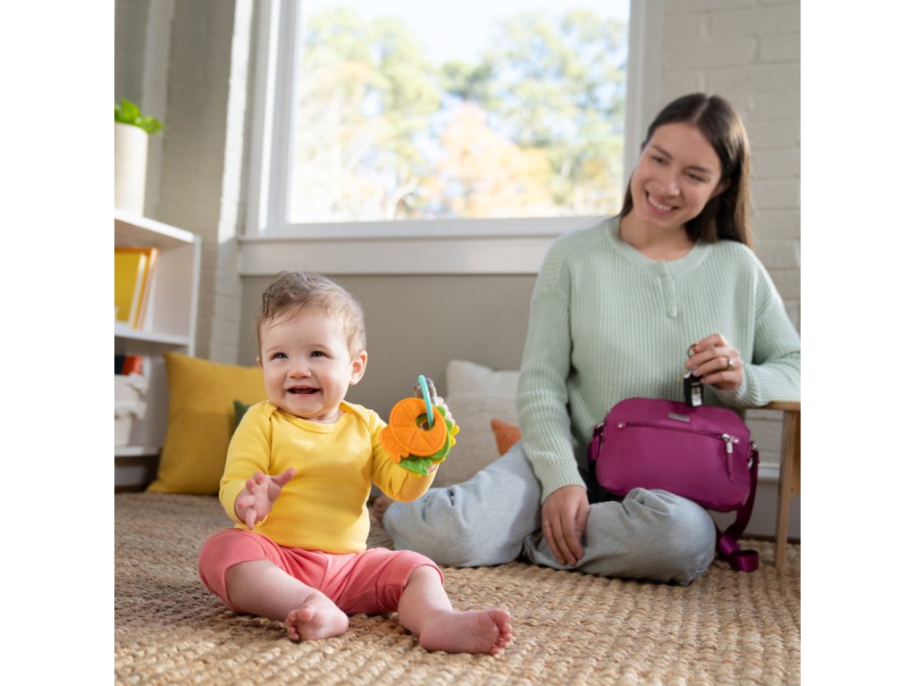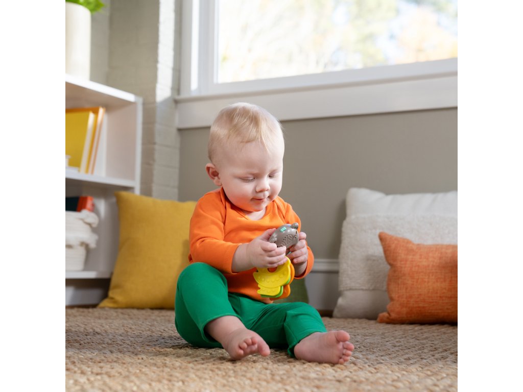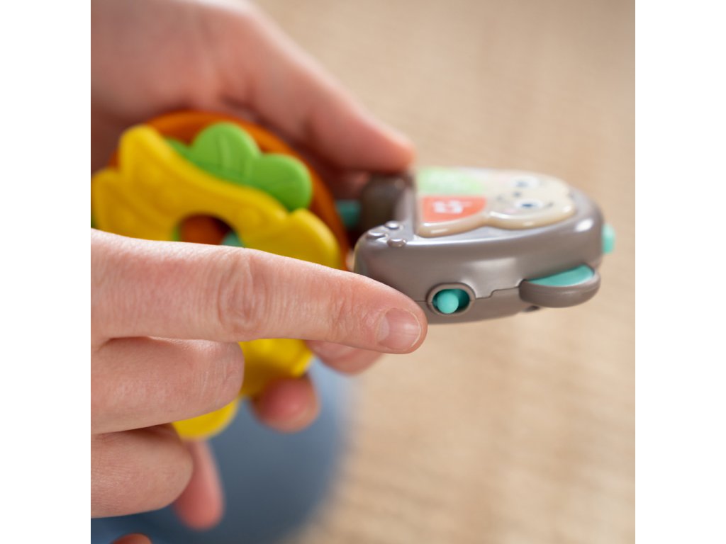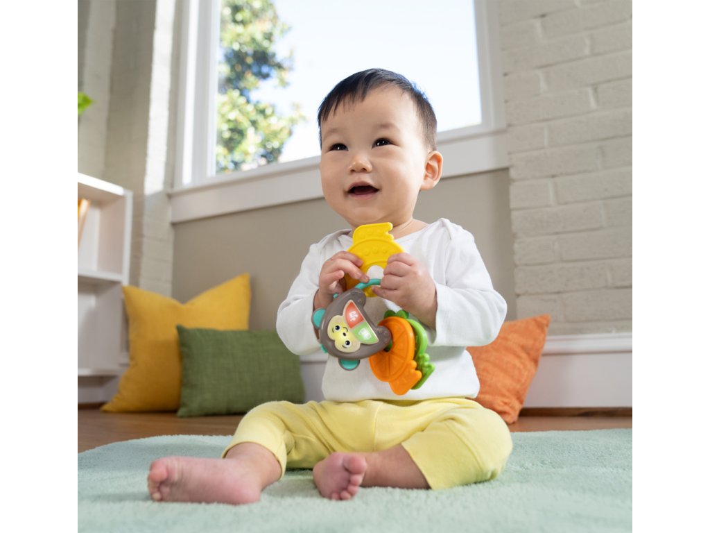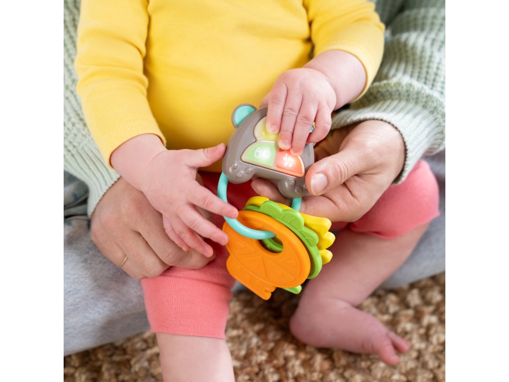 Zábavná hračka umožní děťátku cítit se a dělat věci jako máma a táta s vlastní sadou klíčů. Obsahuje více než 10 veselých zvuků aut, světel a melodií, které podněcují smysly a rozvíjejí motorické schopnosti. Tato interaktivní hračka je ideální pro doma i na cesty. Obsahuje milého opičího kamaráda, tři barevná tlačítka a texturované klíče ve tvaru ovoce. Pomáhá rozvíjet hmat, sluch a zrak miminka a podporuje učení se příčiny a následku. Hračka je lehká, přenosná a vejde se do většiny tašek na pleny.
