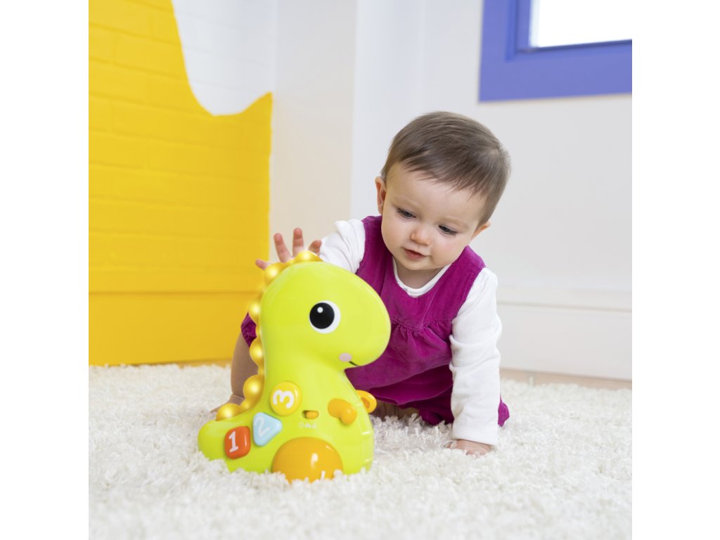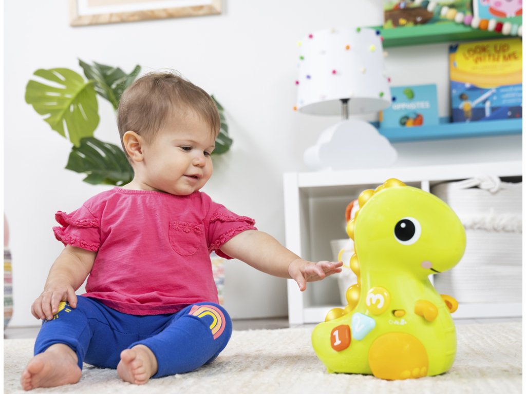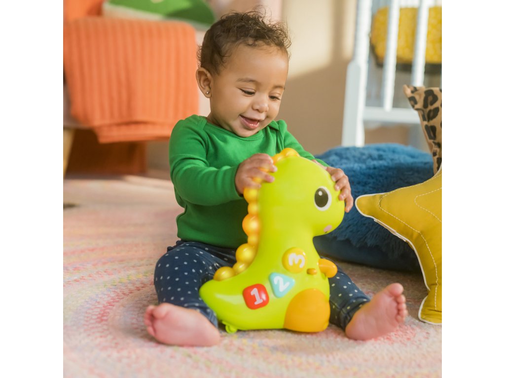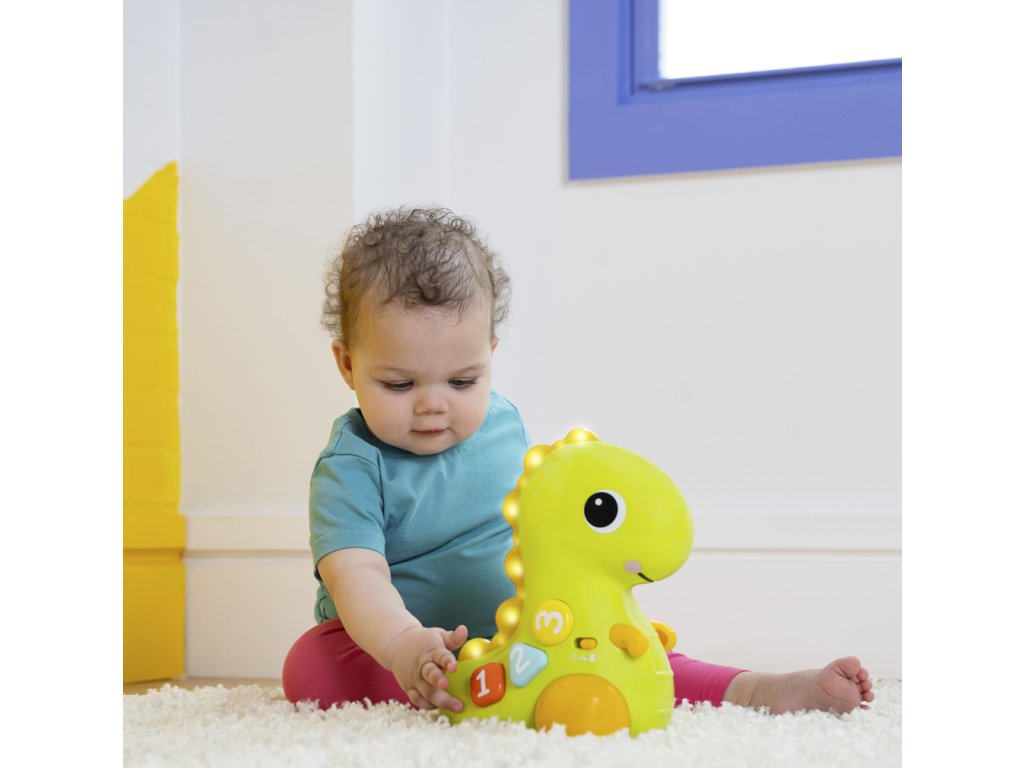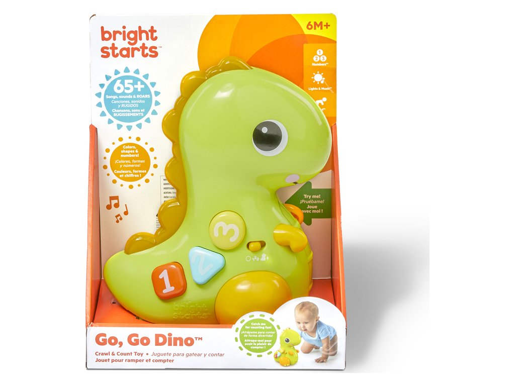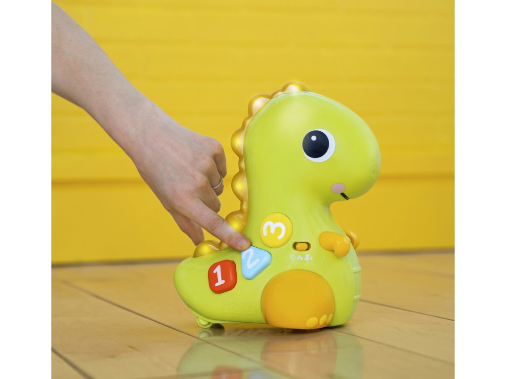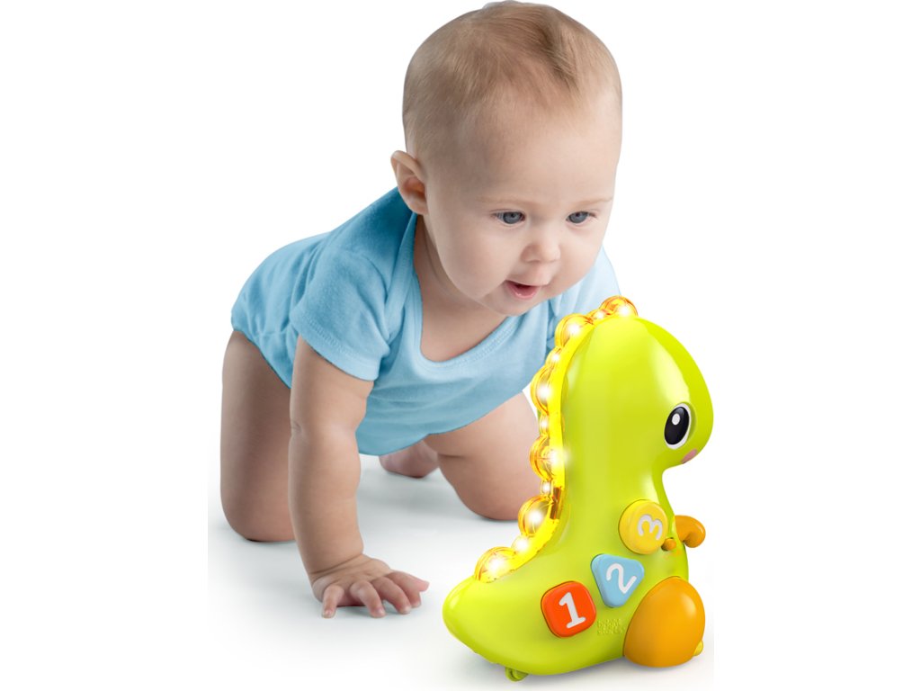 Aktivní hračka od Bright Starts Dino svítí, hraje a pohybuje se na kolečkách, čímž povzbuzuje dítě k pohybu a plazení. Když se děťátko dostane k této hračce, může objevovat čísla, barvy a tvary pomocí lehce mačkatelných tlačítek. Klepnutí na nos aktivuje hudbu, světla, pohyb a směšné zvuky.
