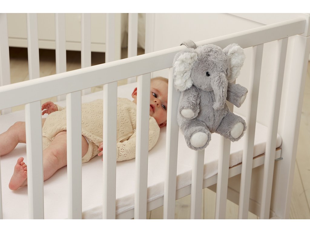 Usínáčka můžete snadno zavěsit na postýlku dítěte, postavit na noční stolek či položit do postýlky. Vyjímatelný hudební box se světlem je možné používat i samostatně mimo hračku slona.