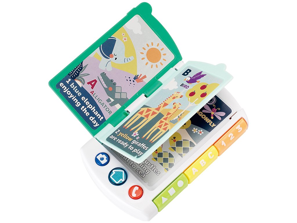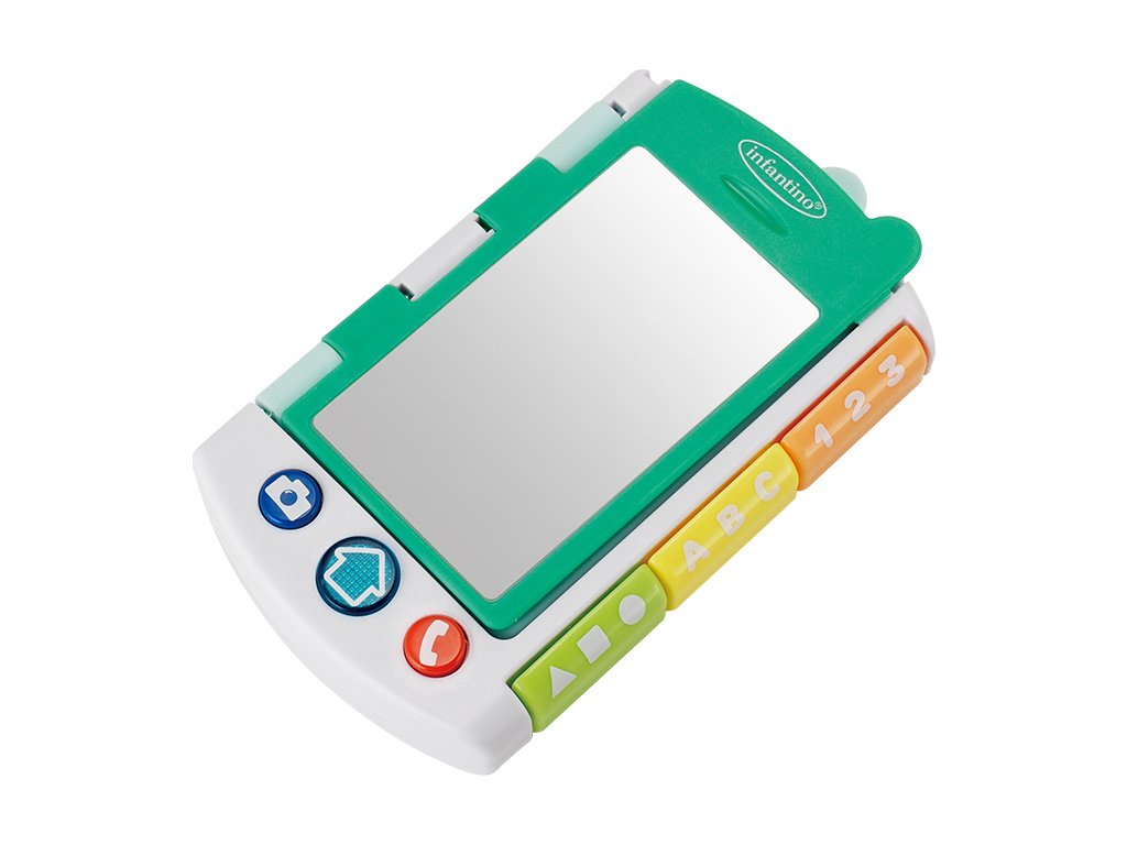 Zábavná interaktivní hračka Infantino, která spojuje telefon na hraní a malou obrázkovou knížku plnou překvapení. Na přední straně má velké zrcátko a tlačítka, se kterými si dítě může hrát na volání nebo focení. Po otevření stránek se spustí vzdělávací obsah – hračka přečte jednoduché věty a vybízí děti k objevování tvarů, barev a čísel.