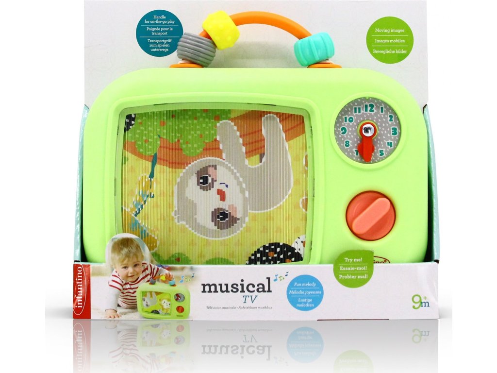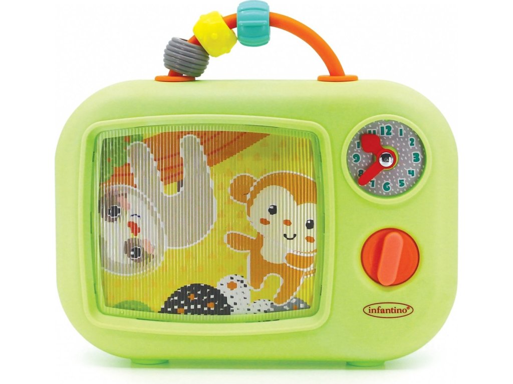 První televize pro vaše dítě po otočení knoflíku hraje příjemnou melodii a obrázky zvířátek na displeji se začnou pohybovat. Držadlo s pohyblivými korálky láká dítě ke zkoumání a zároveň usnadňuje snadňuje přenášení. Hodiny mají pohyblivé ručičky.