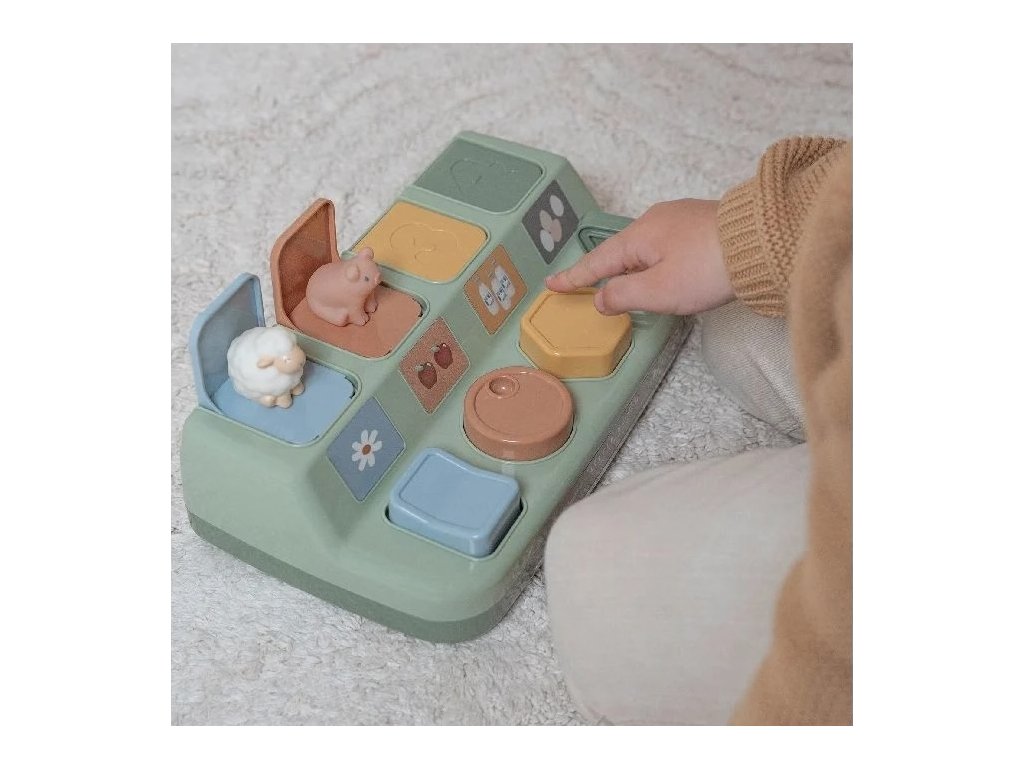Zábavný hrací pultík pro hru na schovávanou se zvířátky podporuje fantazii, kreativitu i motorické dovednosti vašeho dítěte. Které zvířátko se objeví, když stisknete tlačítko? Je to ovečka, prasátko, kravička nebo kuřátko? Pultík můžete využít i pro společnou hru se svým dítětem, učit ho poznávat barvy a tvary i vymýšlet spolu příběhy o zvířátkách.