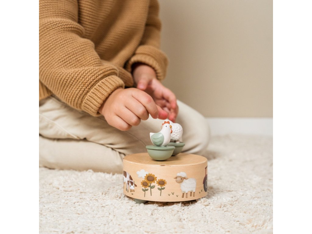 Hudební box v krásném dřevěném provedení s ilustracemi motivů ze života na farmě hraje po natažení melodii „Old MacDonald Had a Farm“, zatímco ovečka a slepička ladně tančí.
