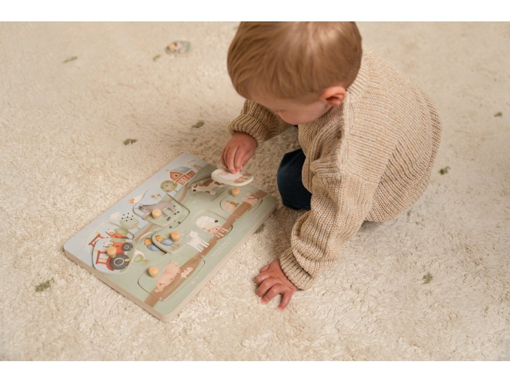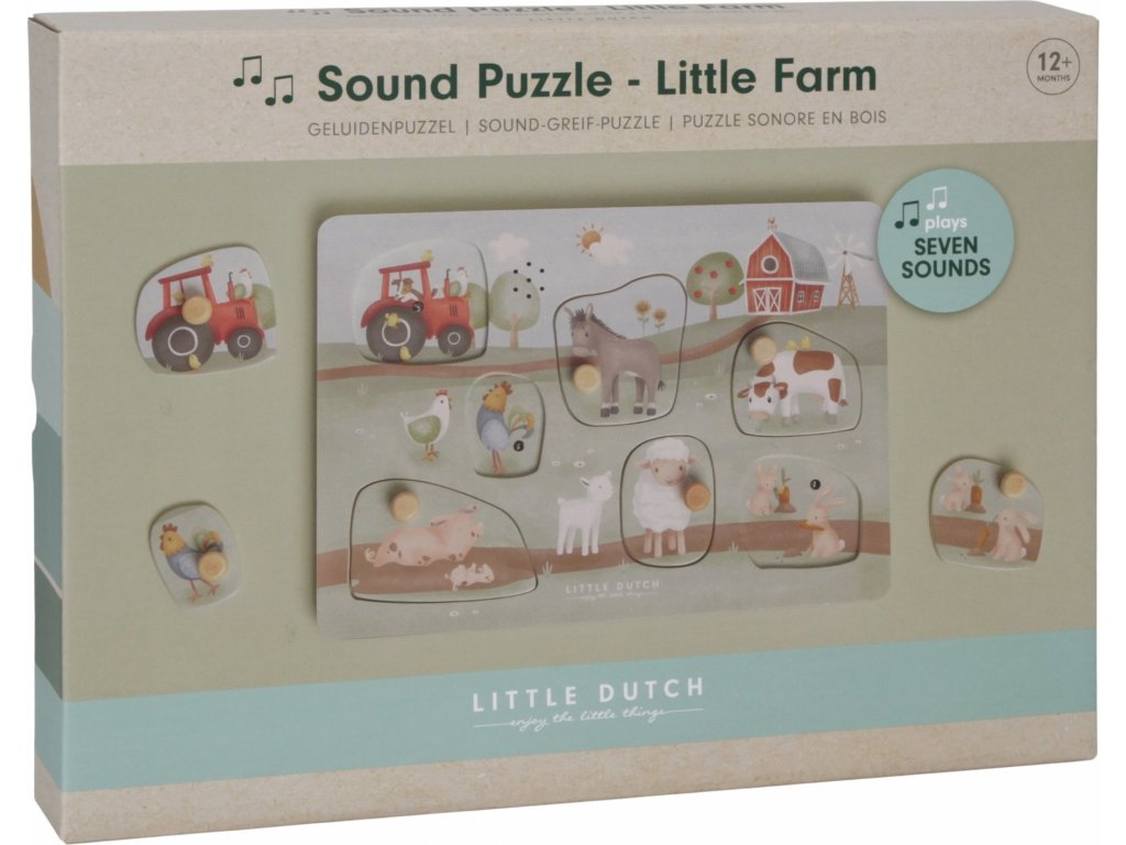 Puzzle hra v dřevěném provedení s krásnými obrázky nabízí 7 různých vkládacích dílů ve tvaru traktoru a zvířátek s jejich hlasy.