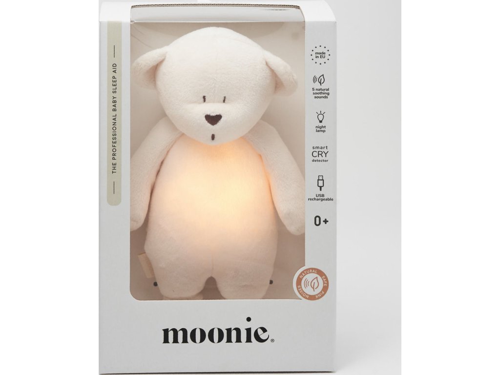 Moonie usínáček v podobě roztomilého medvídka s nočním světlem a relaxačními zvuky pomáhá miminku uklidnit se a snáze usnout. Uklidňující zvuky připomínají dítěti prostředí v děloze maminky před jeho narozením. Usínáček nabízí pět přírodních relaxačních zvuků (tlukot srdce, vítr, lesní potok, mořské vlny, déšť), kalimba ukolébavku, dvě klasické ukolébavky a umožňuje nahrání vlastního hlasu.