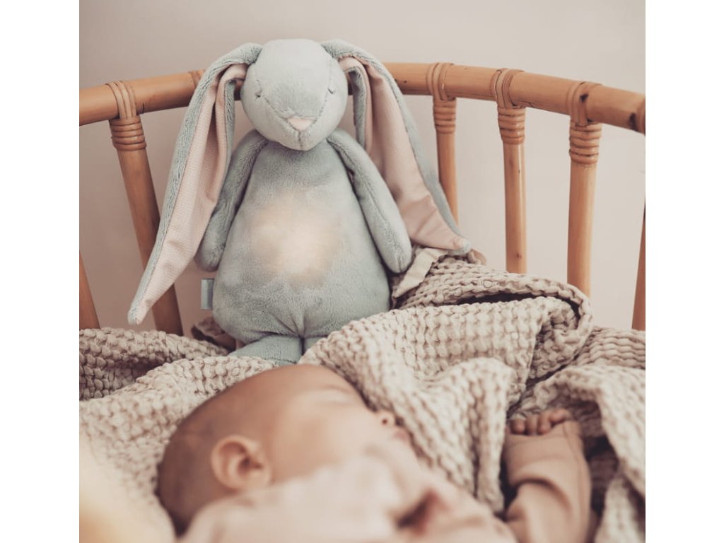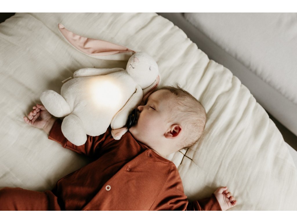 Bříško zajíčka svítí a slouží jako noční světlo s výběrem sedmi barev svícení. Jemné světlo pomáhá dítěti cítit se v postýlce bezpečně. Světlo je možné zapnout i bez zvuků. Při zapnuté funkci Shake světlo zapnete zatřesením hračkou. Zajíček se při svícení nijak nezahřívá a je pro dítě zcela bezpečný.