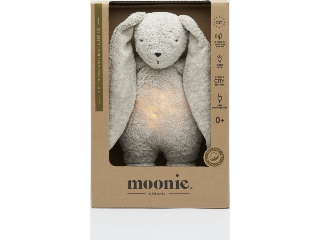 Moonie usínáček v podobě roztomilého zajíčka s nočním světlem a relaxačními zvuky pomáhá miminku uklidnit se a snáze usnout. Uklidňující zvuky připomínají dítěti prostředí v děloze maminky před jeho narozením. Usínáček nabízí pět přírodních relaxačních zvuků (lůno matky, vítr, lesní potok, mořské vlny, déšť) a ukolébavku, složenou speciálně pro novorozence.