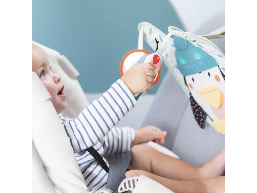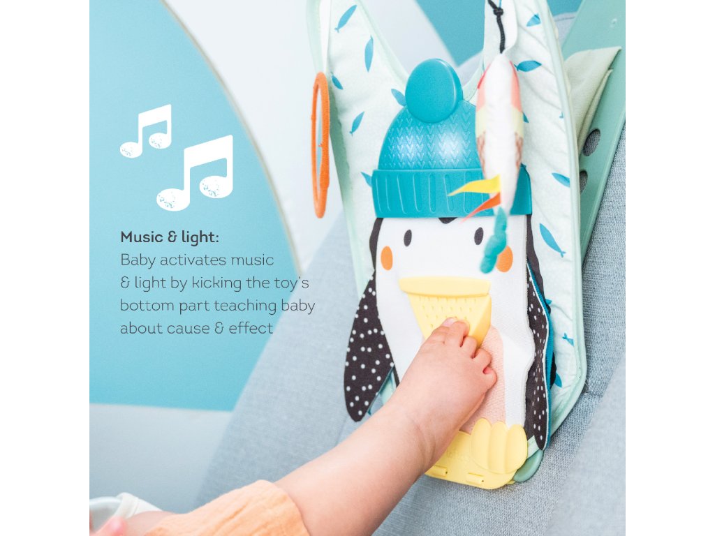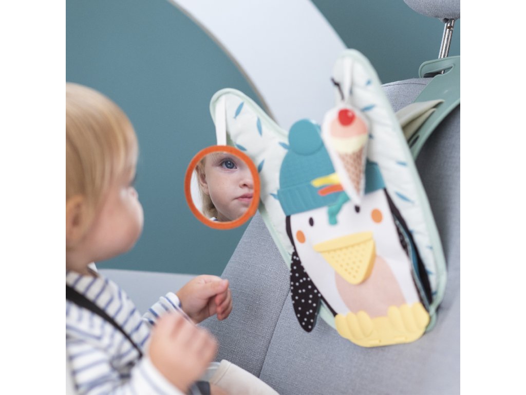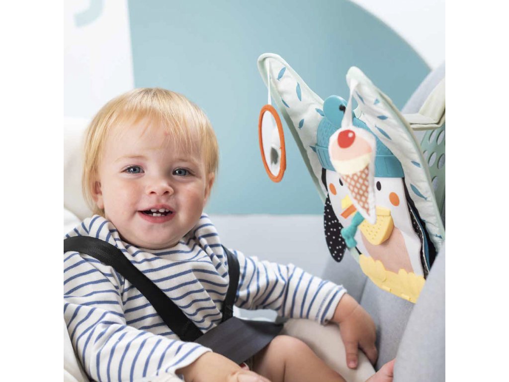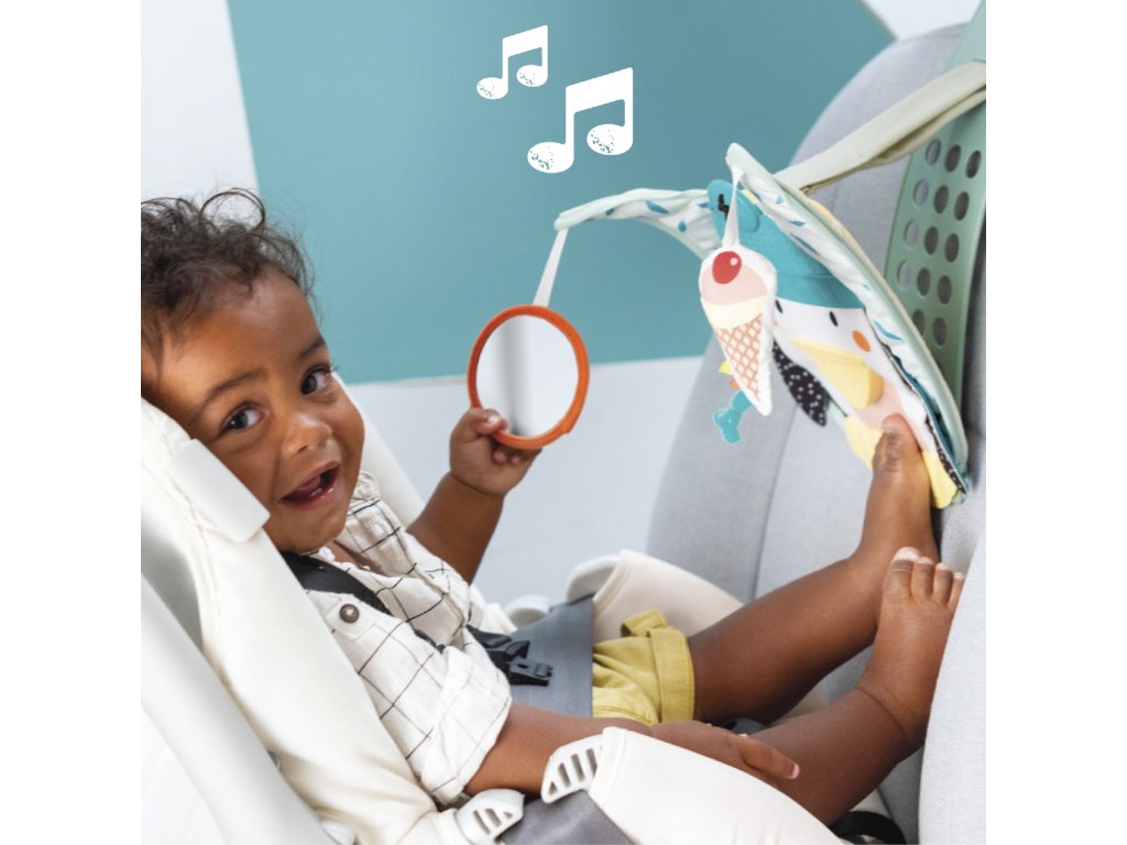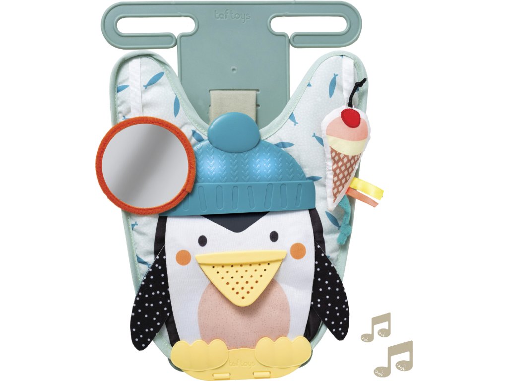 Hrací pultík do auta Taf Toys s hudbou a světélky zabaví vaše miminko na cestách autem a zajistí vám klid při řízení. Pultík se připevňuje na sedadlo nad autosedačku proti směru jízdy. Hudbu i světýlka dítě aktivuje kopáním nožiček do spodní části pultíku. Dítě se tak učí příčině a následku a rozvíjí své motorické dovednosti. Dvě zavěšené hračky - bezpečné zrcátko a chrasticí zmrzlina- lákají ke zkoumání a podněcují rozvoj smyslů dítěte.