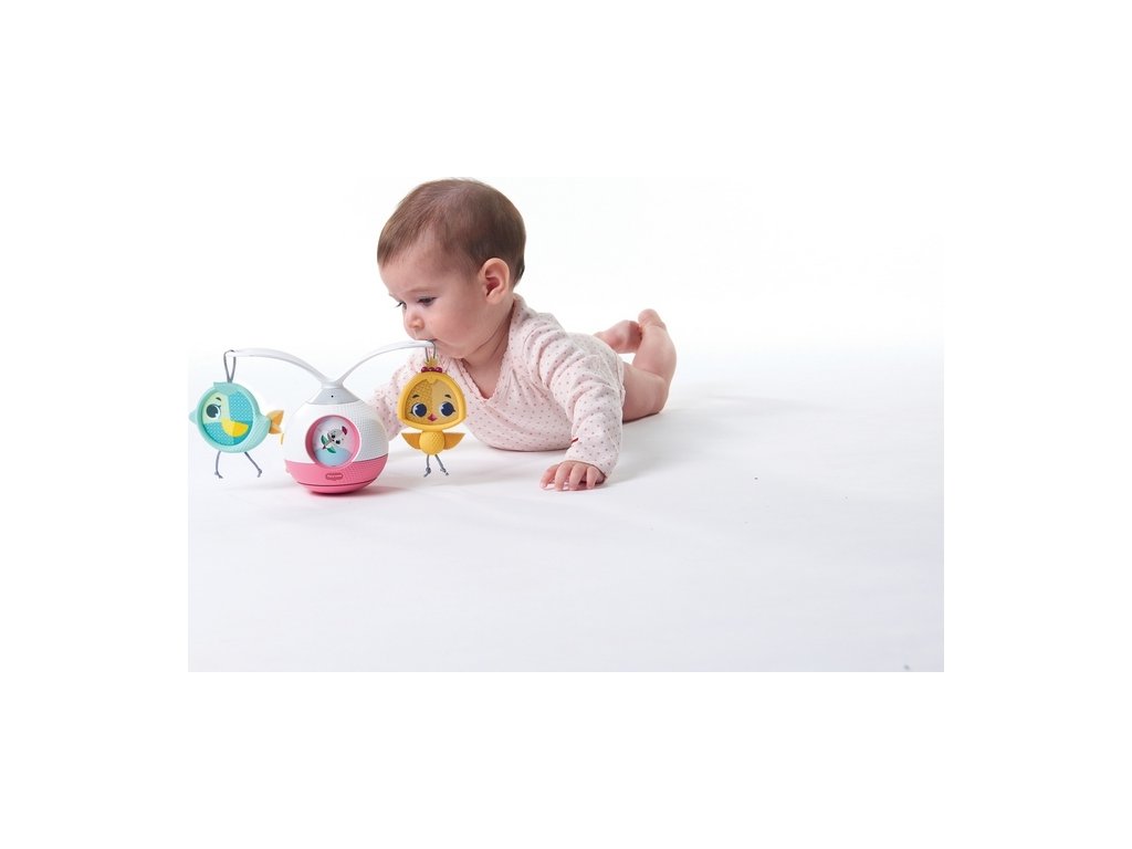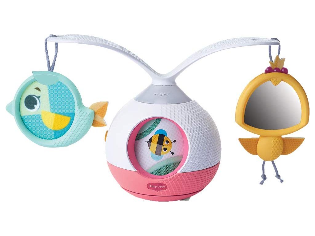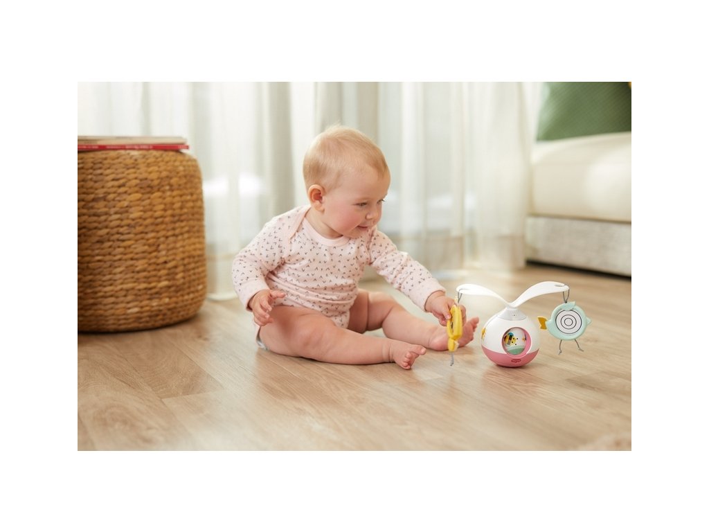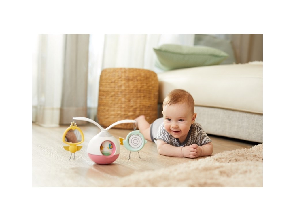 Na ramenou, otáčejících se o 360°, upoutá pozornost dítěte zavěšené oboustranné zrcátko i výrazné hologramové obrázky. Obrázky zvířátek se pohybují i v okénku hudebního boxu. Hračka umožňuje nastavit automatické přehrávání až 30 minut melodií spolu se světýlky. Další variantou je pouštění hudby a světýlek dotykem, dítě se tak učí příčině a následku.