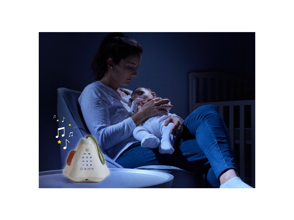 Hudební box nabízí 17 různých uklidňujících melodií, 5 typů bílého šumu a a jedinečný utišující zvuk. Zabudovaný MP3 přehrávač umožňuje rodiči vybrat a přehrávat jakokoli další hudbu podle preferencí dítěte. Box je vybaven ovládáním hlasitosti i možností automatického vypnutí. Poutko usnadňuje přenášení boxu.