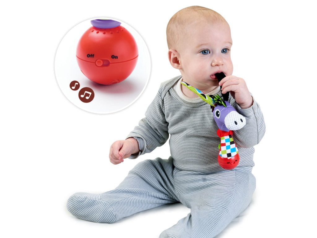 Hudební zvířátko je vyrobeno z různých druhů textilií, které rozvíjí hmatové schopnosti.