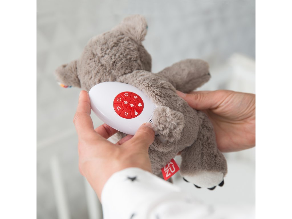 V bříšku zvířátka se skrývá zvukový modul, kde si můžete vybrat 3 tradiční ukolébavky a 3 zvuky. Tlukot srdce, bílý šum a zvuky přírody.