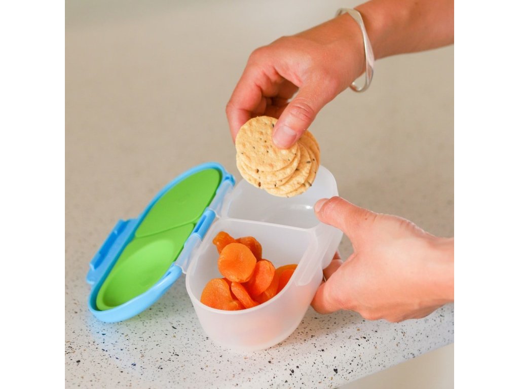 Svačinový box od b.box vám zjednoduší a zpříjemní čas na svačinu nebo přesnídávku. Díky jeho velikosti ho můžete vzít prakticky kamkoliv a být tak vždy vyzbrojení až na bříška zaútočí hlad. Díky flexibilnímu víčku na jedné straně můžete do krabičky vložit celý kus ovoce a do druhé třeba i jogurt nebo pyré. Je vhodný i do mrazáku.