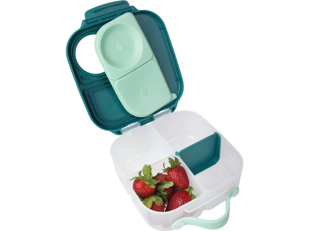 Všechny věci, které milujete na velkém svačinovém boxu od b.box najdete nyní i v menší verzi! Krabička na svačinu, do které se vejde úplně všechno. b.box navrhl variabilní lunchbox, do kterého zabalíte nespočet různých druhů svačinek. Najdete zde oddělení pro ovoce, zeleninu, nebo na čtvrtky nakrájený toast. Naprosto jedinečné zpracování víčka krabičky s elastickým kroužkem umožní vložit do krabičky celé jablko! Silikonové dvojité víčko pak dovolí skladovat v menších odděleních jogurt nebo dip (nikoli tekutiny). Některé vnitřní "přepážky" jsou vyjímatelné a nastavitelné, takže si tento svačinový box přestavíte podle svých chutí a potřeb. Do lunchboxu se vejde například i wrap nebo banán, je jen na vás, co dítěti do tohoto svačinového boxu zabalíte :-). Jednoduché otevírání umožní dětem samostatně se obsloužit.