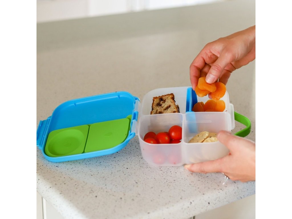 Všechny věci, které milujete na velkém svačinovém boxu od b.box najdete nyní i v menší verzi! Krabička na svačinu, do které se vejde úplně všechno. b.box navrhl variabilní lunchbox, do kterého zabalíte nespočet různých druhů svačinek. Najdete zde oddělení pro ovoce, zeleninu, nebo na čtvrtky nakrájený toast. Naprosto jedinečné zpracování víčka krabičky s elastickým kroužkem umožní vložit do krabičky celé jablko! Silikonové dvojité víčko pak dovolí skladovat v menších odděleních jogurt nebo dip (nikoli tekutiny). Některé vnitřní "přepážky" jsou vyjímatelné a nastavitelné, takže si tento svačinový box přestavíte podle svých chutí a potřeb. Do lunchboxu se vejde například i wrap nebo banán, je jen na vás, co dítěti do tohoto svačinového boxu zabalíte :-). Jednoduché otevírání umožní dětem samostatně se obsloužit.